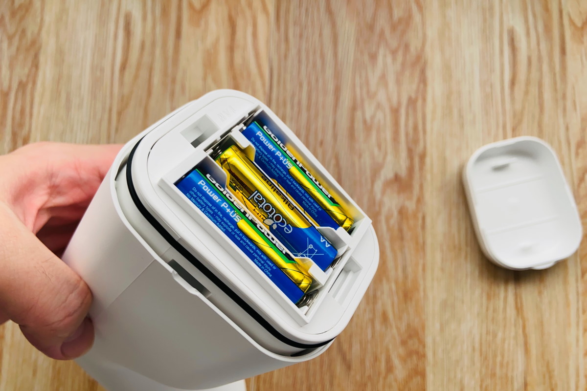まず、本体の底面のフタを外して付属の単三乾電池3本を入れます。続いて、上部のフタとキャップを外し、泡ハンドソープ液を入れます。タンクの容量は200mlでいっぱいという感じ。なお、本体の背面にはスリットがあり、そこからハンドソープ液の残量が確認できます。このオートディスペンサー本体はIPX4相当の生活防水仕様なので、多少の水しぶきがかかっても大丈夫。ただし完全防水ではないので、丸ごと水洗いしたり水没はNGです。