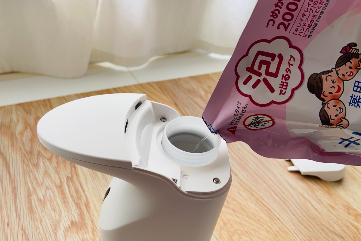 このオートディスペンサーがいいと思ったのは、これまでプッシュ式で使っていたキレイキレイの泡ハンドソープ液がそのまま使えるという点。コロナ禍で手を洗う回数が増えたので、我が家では泡ハンドソープ液を多めにストックしていました。それがそのままこのオートディスペンサーでも使えるのがすごくいいなと感じたのです。キレイキレイの泡ハンドソープ液は、近所のスーパーでもドラッグストアでもどこでも買える便利さと、大容量の詰め替えパックや詰め替えボトルなどもラインナップしており価格の手ごろさが気にいってずっと愛用しています。