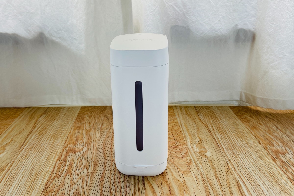 以上で準備は完了。さっそく使ってみましょう。まず、本体前面の下部にある電源スイッチを入れましょう。電源オンの状態では青色のランプがゆっくり点滅します。このオートディスペンサーは基本、つねに電源オンの状態にしておくものですが、ランプの点滅が気になる場合はオフにしてもよいでしょう。ちなみに筆者は2月に購入してから1か月以上、電源をオンにしたまま使っていますが、まだ電池を交換する必要がないので、常時オンでも電池の消耗はほとんどなさそうです。