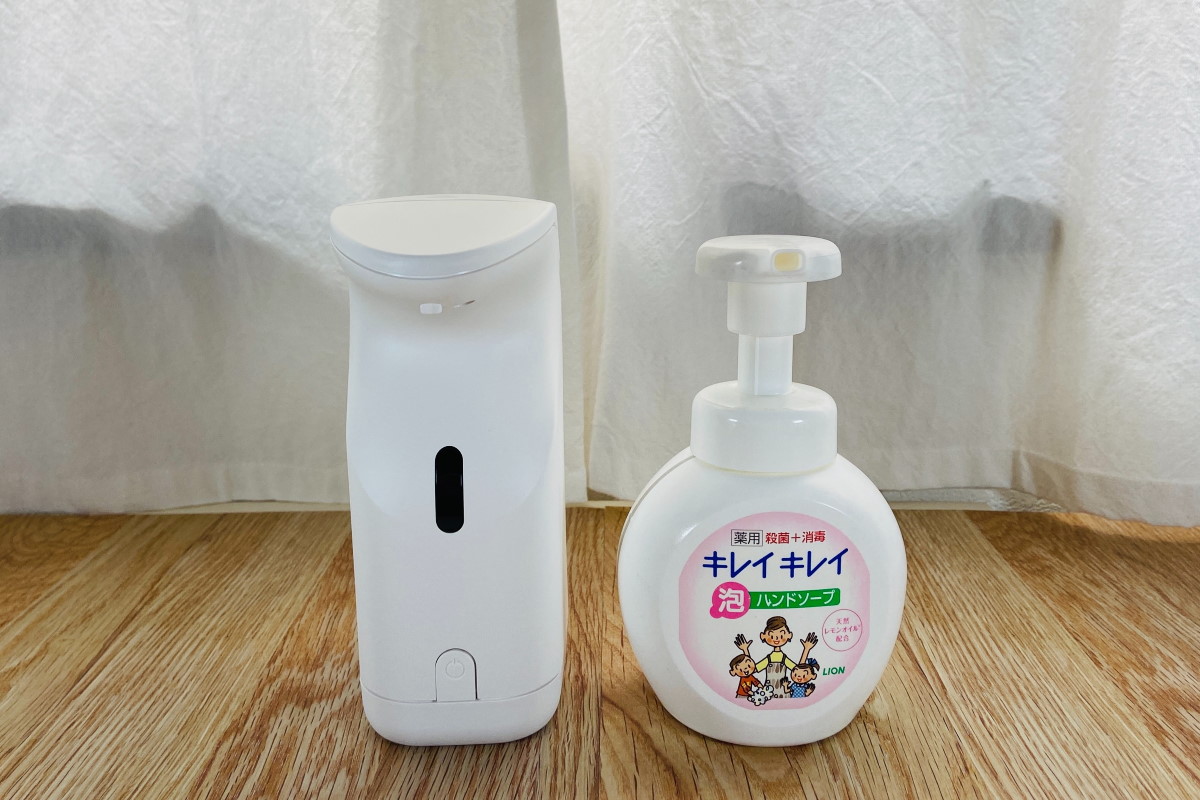 これまで自宅では泡で出るタイプのプッシュ式ハンドソープを愛用してきましたが、帰宅してまず手を洗う、というときにポンプの上部に触れることがなんとなく憚られるようになり、指ではなく手の甲で押すなどなるべく容器に触れないように工夫していました。そんなときにネットで見つけたのが、ライオンがキレイキレイブランドから発売した「薬用 泡ハンドソープ専用オートディスペンサー」です。