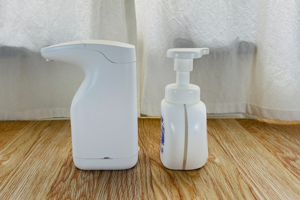 これまでも家庭用のオートディスペンサーがあるのは認識していたのですが、他社のは専用ボトルしか使えず、それゆえ詰め替えコストがやや高いので購入には踏み切れませんでしたが、こちらのモデルは汎用性があります。我が家は泡ハンドソープの容器を洗面台やキッチン、トイレなどいろいろな場所に置いて使っていますが、オートディスペンサーでも従来のプッシュ式容器でも同じ泡ハンドソープ液を共用できるので、オートディスペンサー用に別途用意しなくてもいいのが非常に便利です。