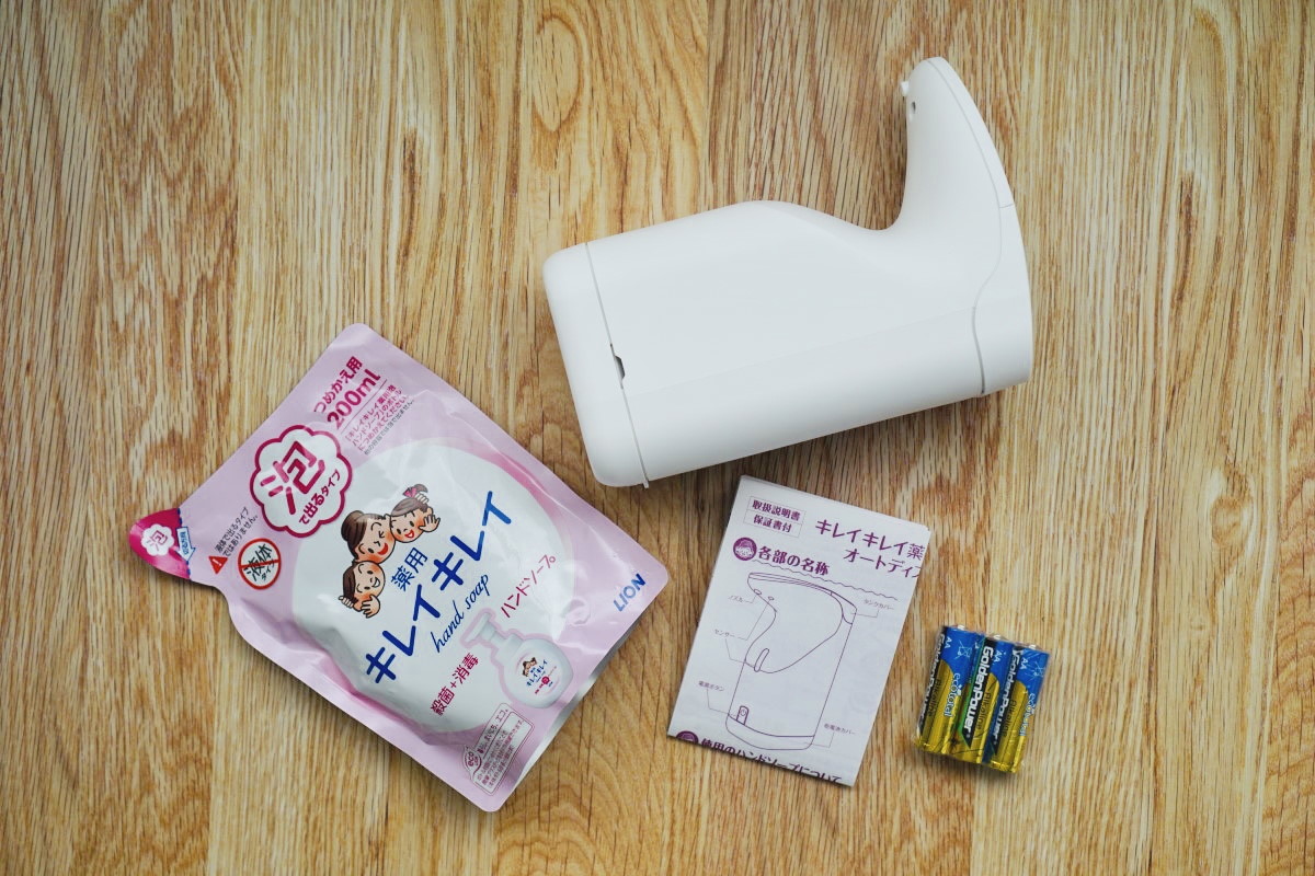 製品を見ていきましょう。まず、パッケージにはオートディスペンサー本体と、詰め替え用のキレイキレイ泡ハンドソープ液(200ml)、単三乾電池3本、説明書が同梱されています。キレイキレイの泡ハンドソープ液は「シトラスフルーティー」「フルーツミックス」「フローラルソープ」の3種類の香りがありますが、付属しているのはベーシックな「シトラスフルーティー」です。なお、どの香りでも使えますが、トロッとした液体の自分で泡立てる「液体ハンドソープ」は使えませんので注意しましょう。こちらは「泡ハンドソープ専用」です。