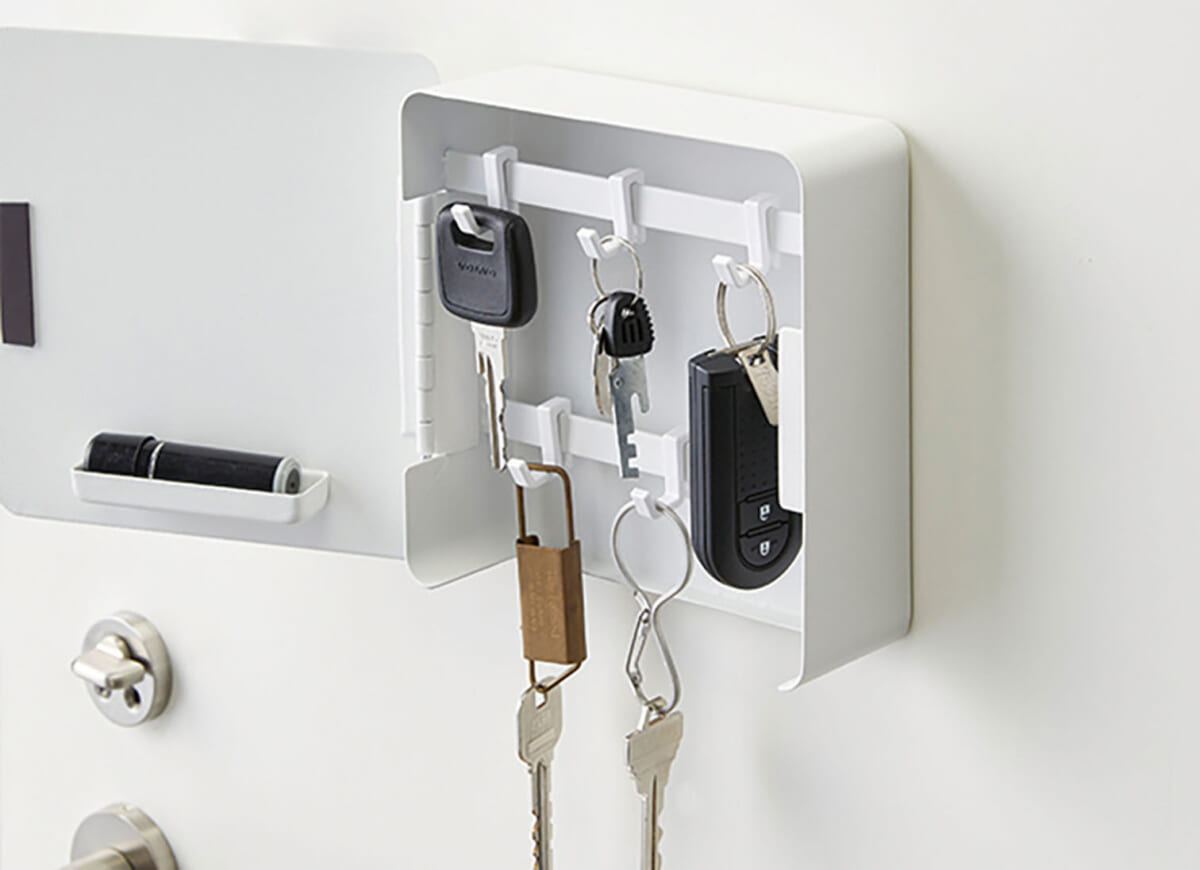 マグネットを付けられる玄関扉に設置可能なキーフック。シンプルなデザインのカバーを開けると、着脱式の5つのフックに鍵をぶら下げられる。印鑑が置けるホルダーも搭載し、宅配便の受け取りもスムーズだ。