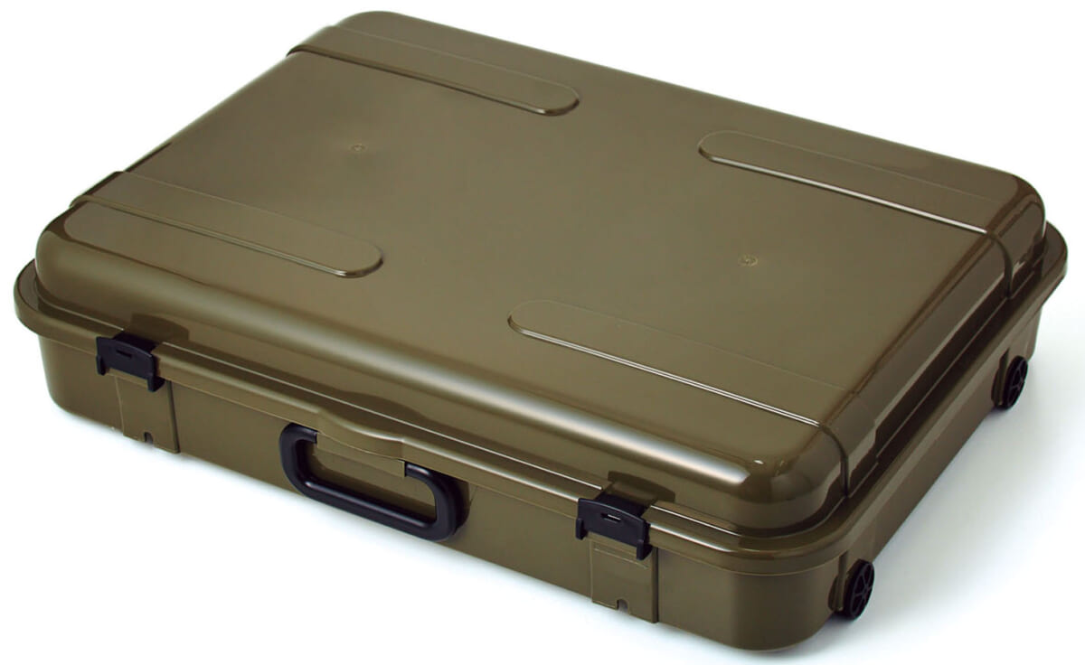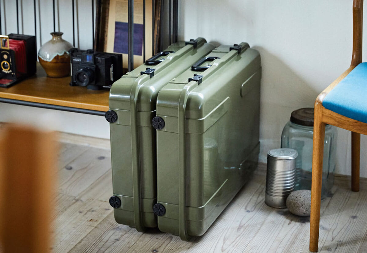 トランクケースをイメージさせる、プラスティック製の収納ボックス。持ち運びやすいように取っ手とキャスターが付いている。ヴィンテージ風デザインで、インテリアとしても◎。カラーはオリーブとホワイトの2色だ。