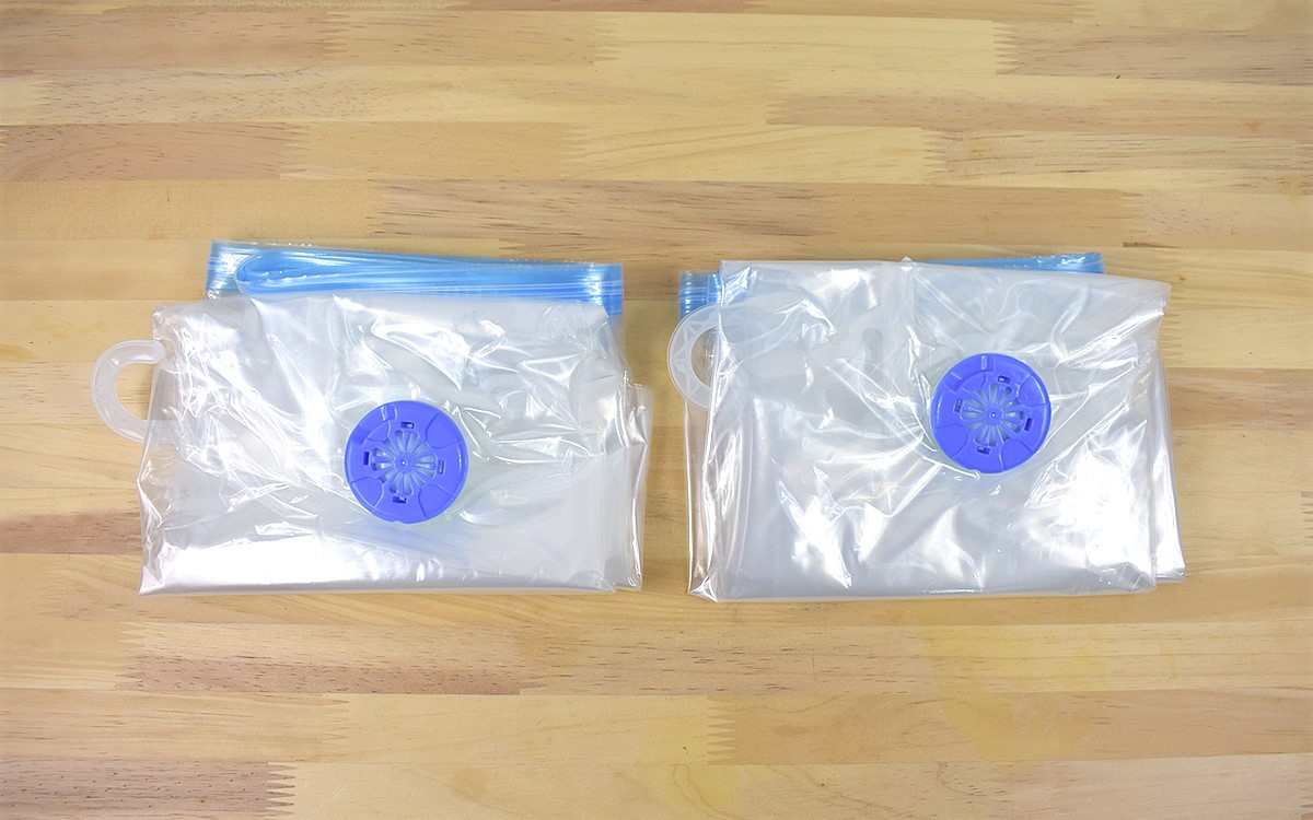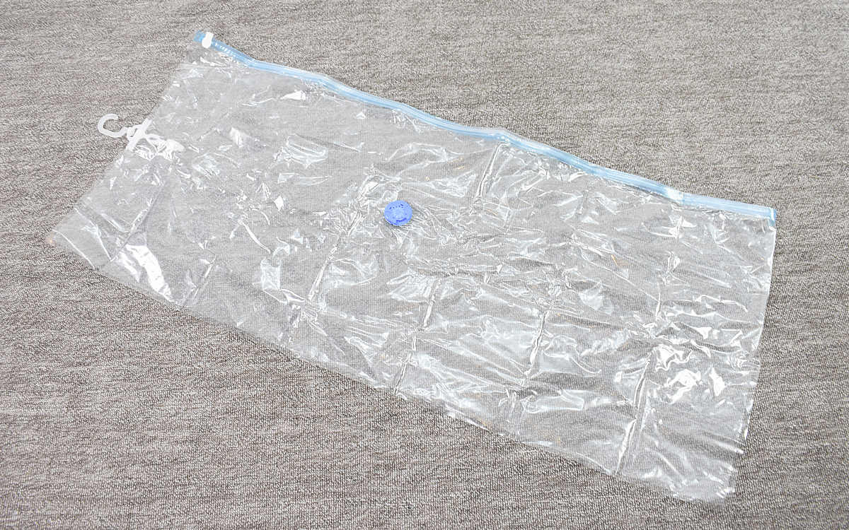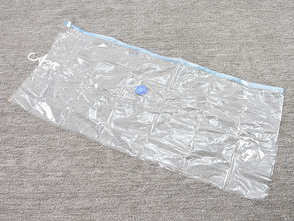 およそ135(幅)×60cm(奥行)の圧縮袋が2枚入っている同商品。見た目は一般的な圧縮袋と変わりませんが、袋の片側には空気を逃がしにくいオートロックバルブがついています。