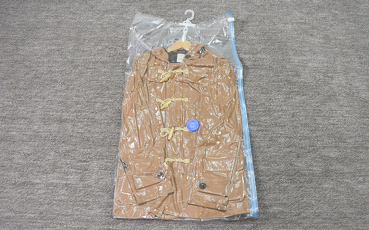 まずはしっかり乾燥させたコートを袋に入れます。乾ききっていない衣類を入れるとカビが発生してしまう恐れがあるため、十分に乾燥させてから袋に入れてください。続いて指で挟みながらスライダーを滑らせればOK。大きなサイズでしたが、難なくチャックを閉められました。