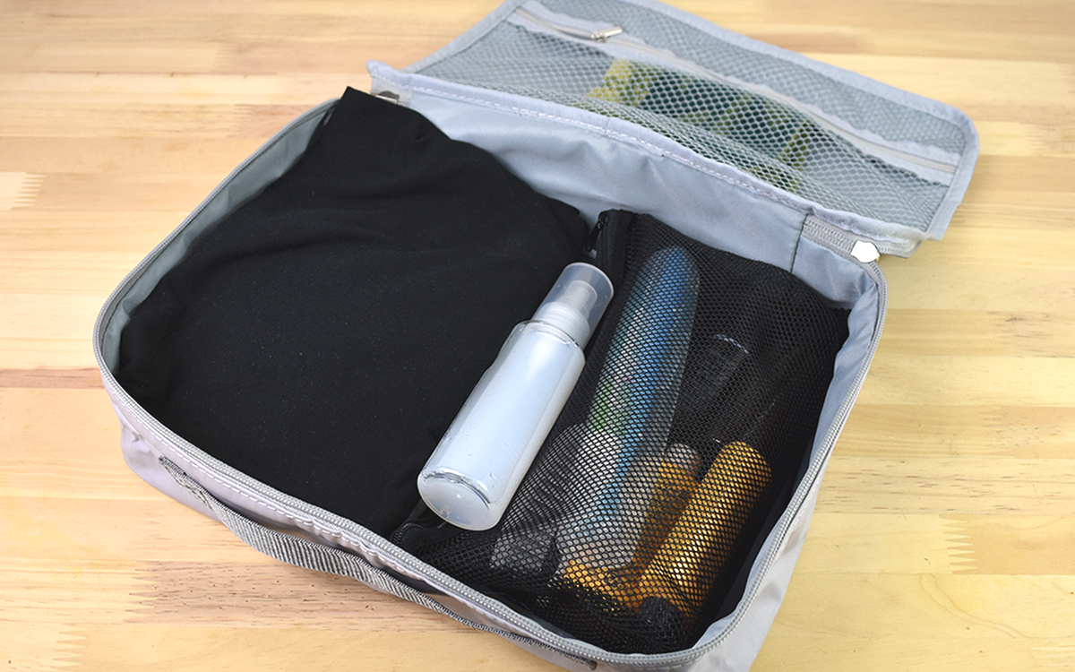 さっそく旅行の必需品ともいえる洗面グッズを収納してみることに。私は手持ちの小物ケースに洗面グッズを入れてから「クーピー柄 クローズケース」に収めましたが、もちろんグッズを直接入れてもかまいません。いつも持ち歩くアイテムを詰め込むと、思ったよりたくさん荷物が収納できて驚きました。