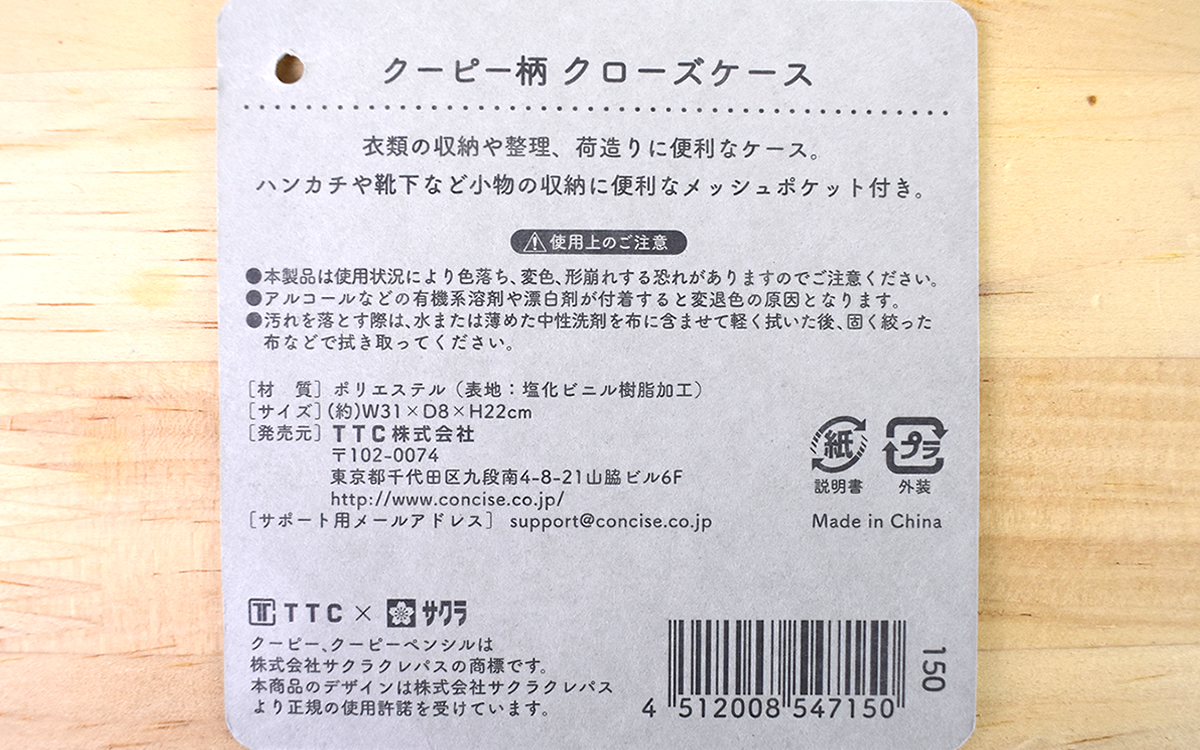 旅行用品や文具用品など、幅広いジャンルの製品を取り扱う「TTC」。同社から発売中の「クーピー柄 クローズケース」は、長年愛されている描画材料「クーピーペンシル」でお馴染み「サクラクレパス」とのコラボ商品です。SNS上でも「まさかのコラボにびっくり!」「クレパスのデザインが懐かしい」と注目を集めていて、中には800件以上の「いいね!」を獲得した投稿もありました。衣類の収納や荷造りに便利なケースでなんです。