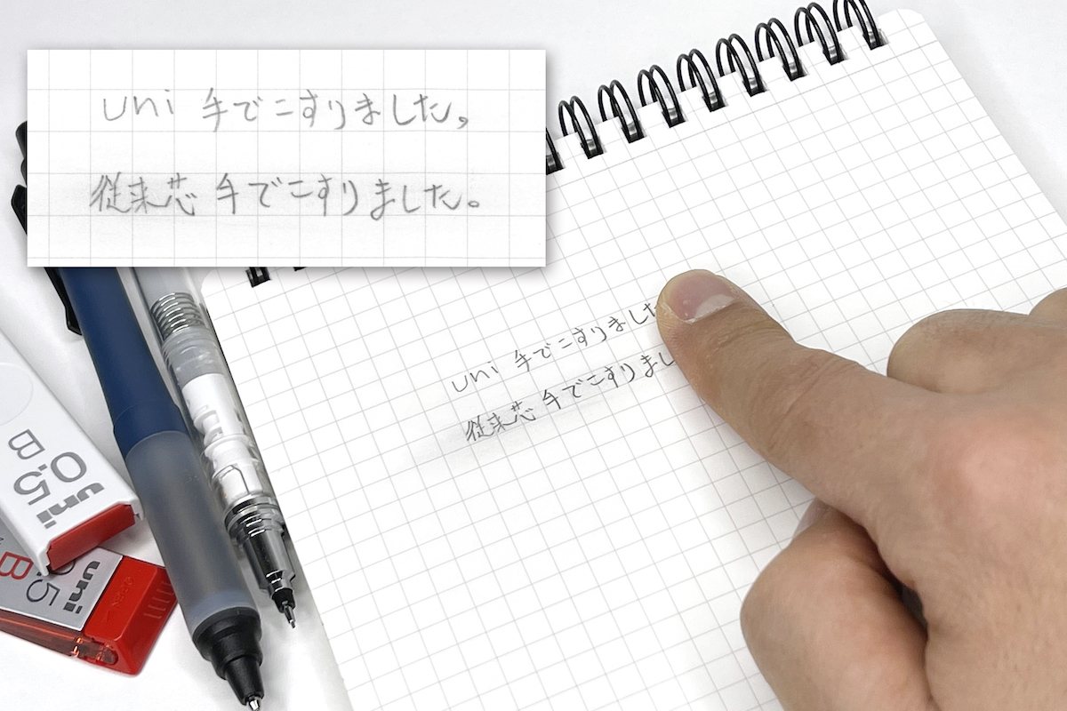 対してuni芯は、芯に特殊な成分を配合することにより、芯の粉がしっかりと紙面に密着して飛び散りを防ぐ、とのこと。なるほど、試してみると確かに擦れたときの芯粉の広がりがまったく違う。手で触ってもスレが少なく、あきらかに汚れにくいのが見て取れるだろう。
