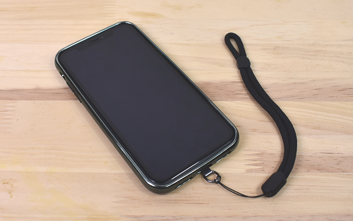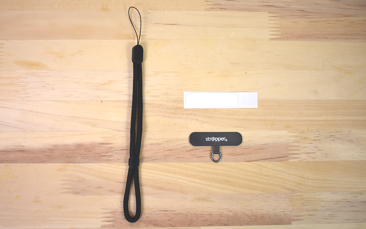 ステンレスで作られた薄いプレートのような同商品。およそ54mm(幅)×29mm(高さ)×0.4mm(厚み)ほどの大きさで、下部にはストラップの紐を通すためのリングがついています。さらに全長約200mmの黒いハンドストラップも付属されており、手首にかけて使うことも可能。ハンドストラップを使えば、思わず手を滑らせてもスマホの落下を防いでくれますよ。