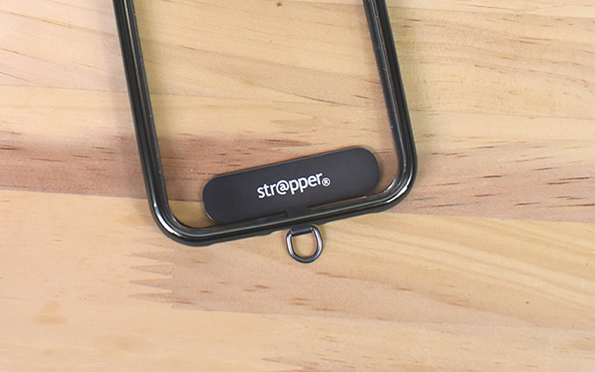 まずはスマホケースの内側に「ストラッパー」をセット。この時本体の下部についているリングがケースの充電用ホールを通るように取りつけていきましょう。