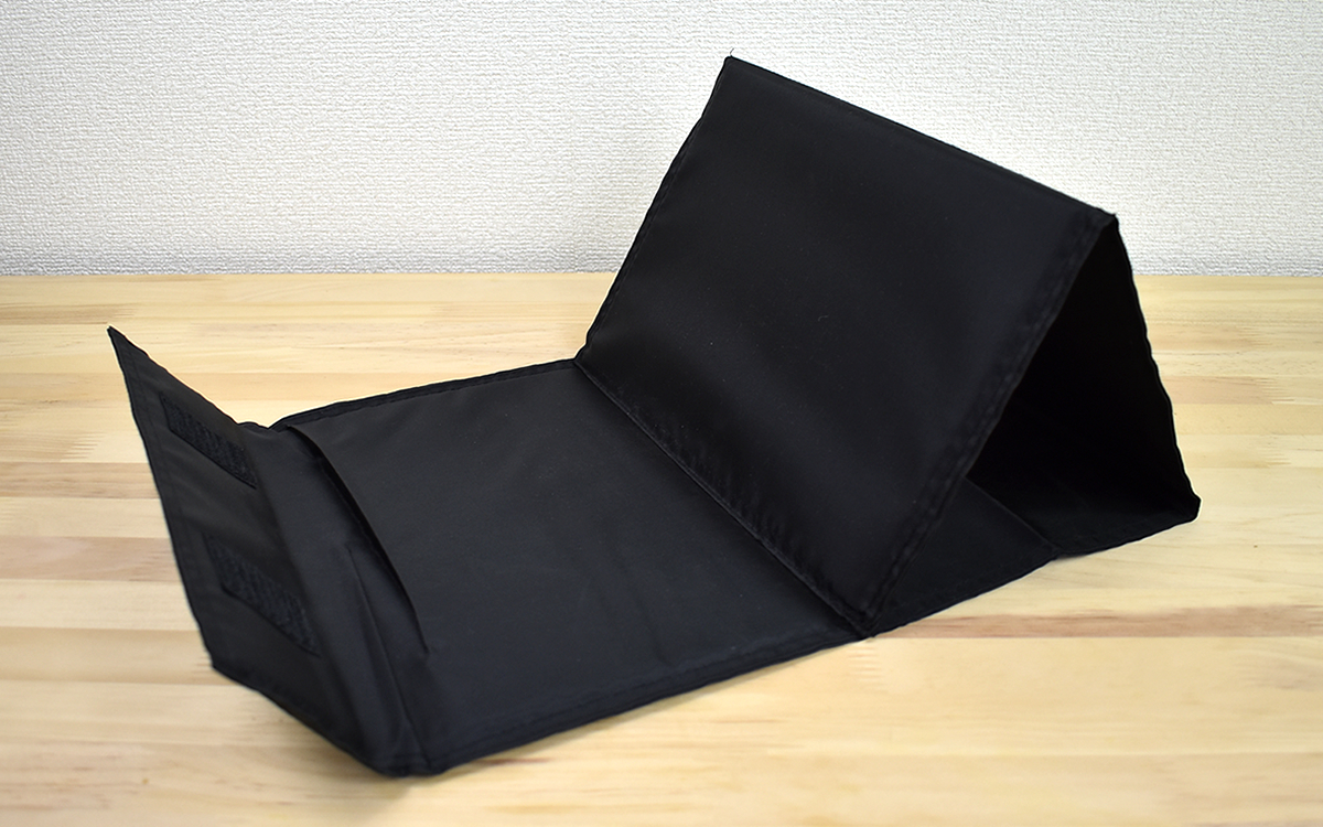 それでは足台としてどのように使用するのか見ていきましょう。セッティングは山折りになっている底面を開いてそのまま床に設置すればOK。2枚の支え板が開いた状態になり、脱いだ靴を中の空間に収納しておくことができます。使用時でもサイズは約26.5cm(幅)×15.5cm(奥)×20cm(高)なので、足元のスペースはそれほど取られません。