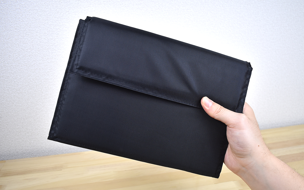 「どこでも足座楽」のサイズは折りたたまれた“収納時”の状態なら約26.5cm(幅)×2cm(奥)×19cm(高)とコンパクト。B5ノートを持ち運ぶように携帯できるのが嬉しいですよね。