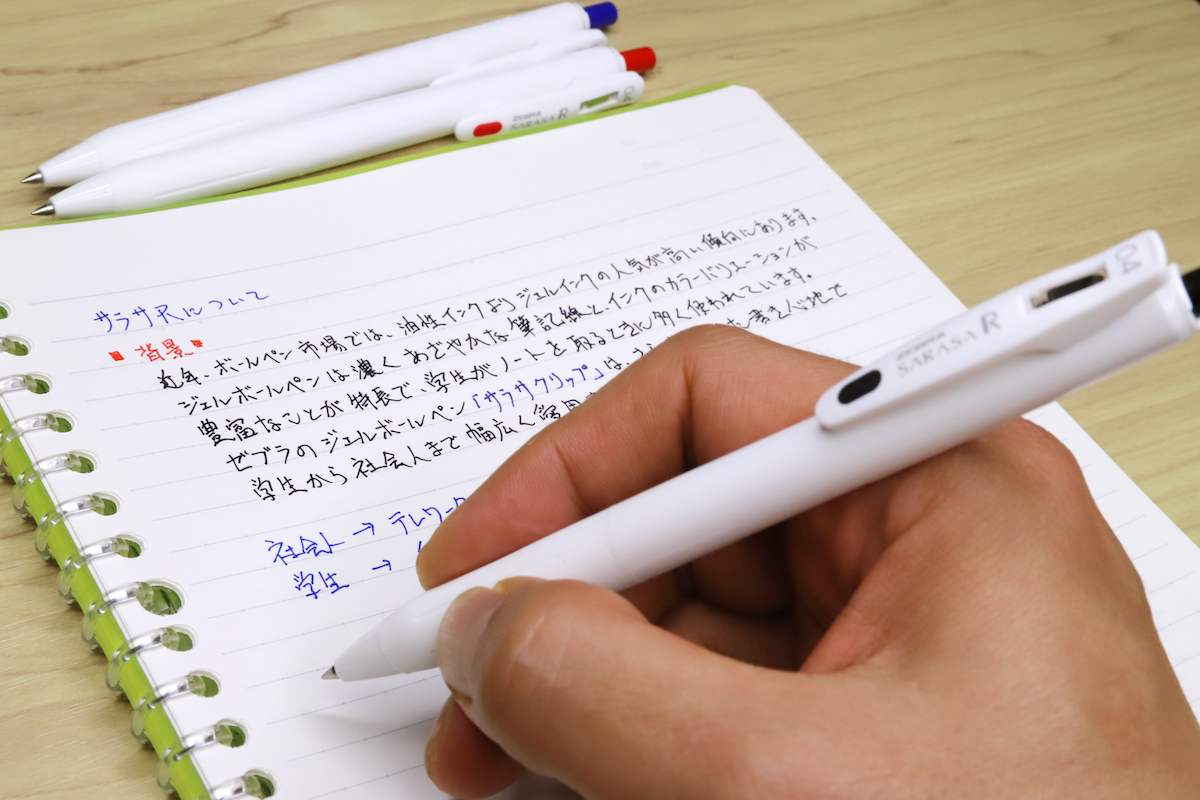 それにしても、クッキリ発色や速乾性を備えながら、価格は従来のサラサと同じ100円(税別)! というのは、なかなか面白い判断だと思う。おそらく120円(税別)のユニボールワンに対するカウンターなのだろう。特に、カラーをあれこれ揃えたい中高生にとっては、1本につき20円は軽視できない差だろう。