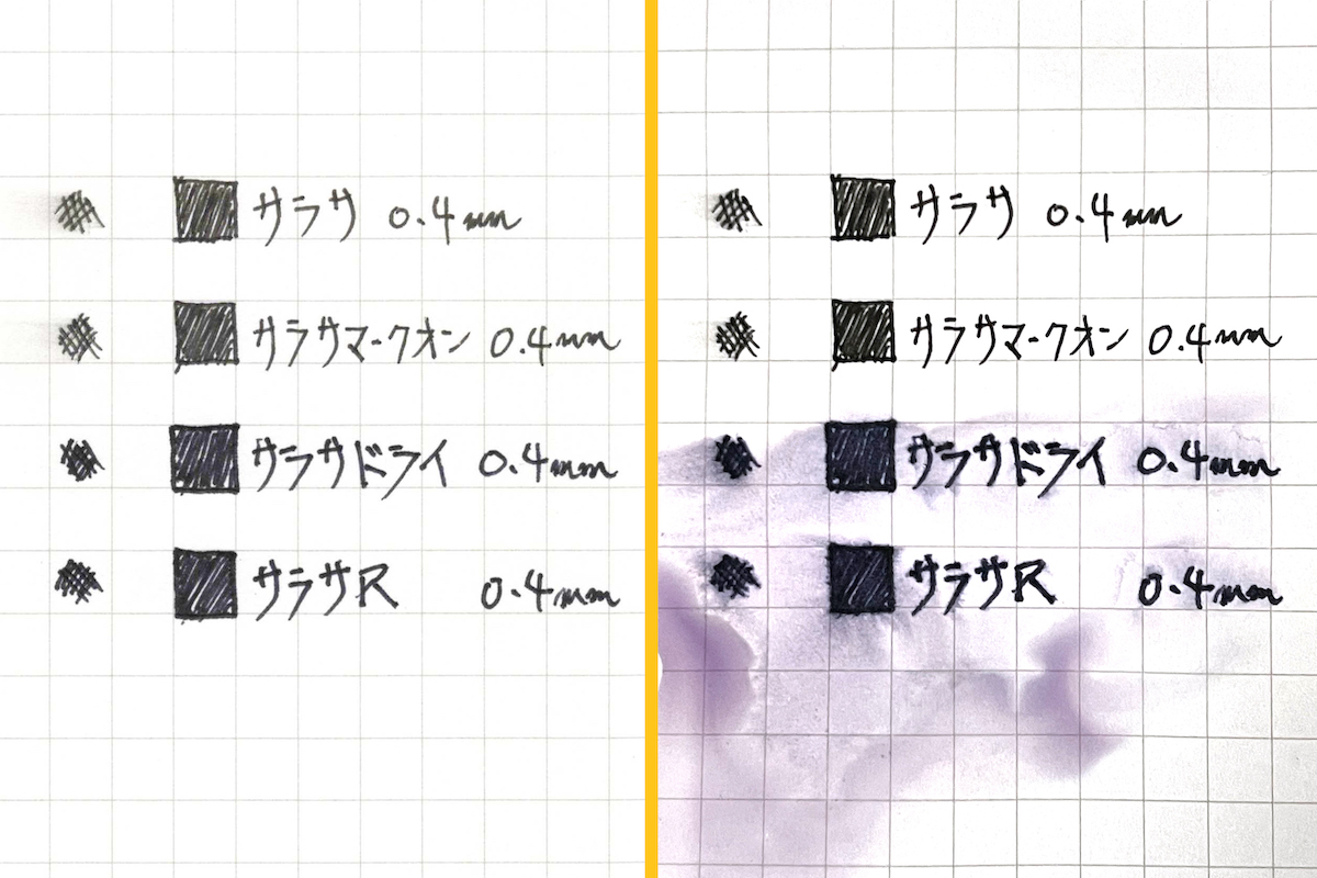 ということで書き比べてみると……正直、黒さで言えば、ユニボールワンのほうが正しく「黒色」だろう。サラサRは従来のサラサシリーズと同じく「赤黒色」傾向、かつ光の反射もあるため、並べてみるとやはり浅く感じられる。
