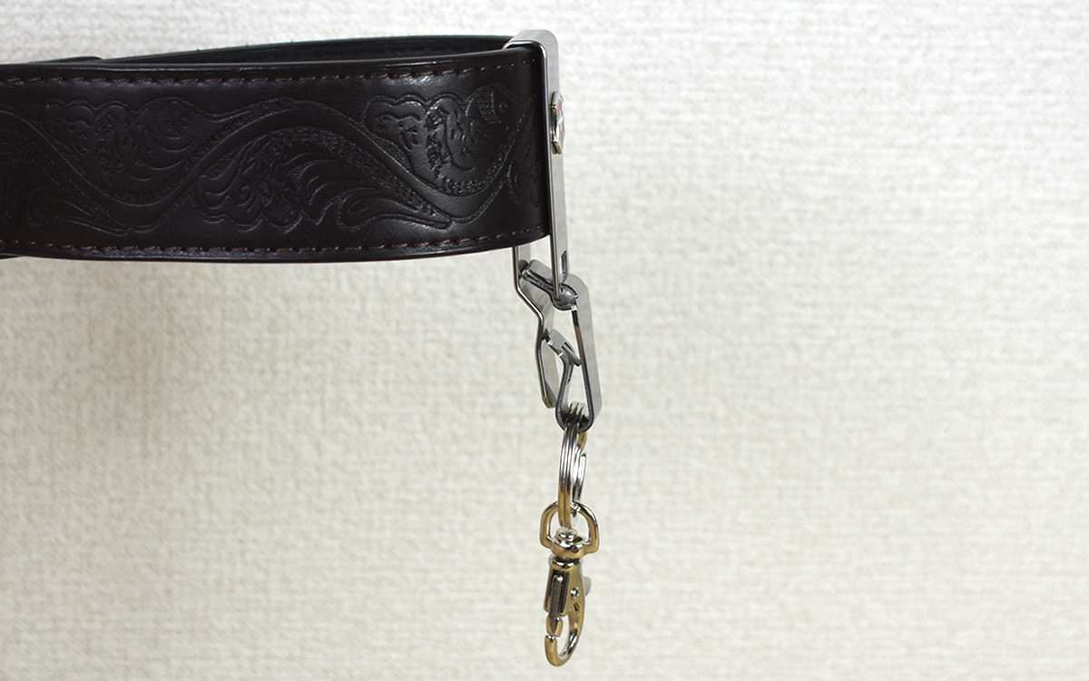 ベルトへの取りつけ方は簡単で、まずはキーリングがついているステンレスパーツを横向きに。そのままベルトの上から差しこみ、再びキーリング側のパーツをグっと下に向かって倒すことでベルトに固定できます。