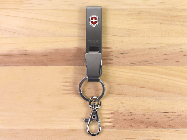 実際にベルトをした状態で取りつけてみても、引っかけたベルトハンガーが外れてしまう気配はありません。ご覧の通りVictorinoxのロゴが正面を向くので、ステンレススチールの無機的な質感にアクセントが加わりますよ。