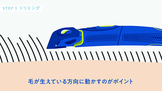 次に、電動スキカミソリを使って長い毛を短くし、剃りやすく整えます。ツルツルにしたくない場合は、トリミングだけで量や形を整えるのもオススメ。