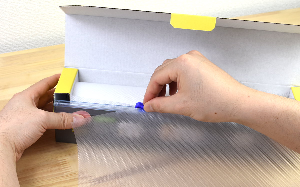 そのものズバリな商品名が心強さを感じさせる同商品。シートの幅は30cmあり、長さはたっぷり8mあります。パッケージを開けてみると、左右どちらからも使えるスライド式カッターが。これならハサミを用意する必要はなく、ラップにありがちな“うまく切れない”という心配はありません。