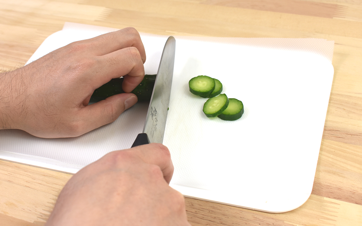 それではシートをまな板に敷いて食材を切ってみましょう。シートの表面には凹凸がついているため材料が滑ってしまうことはなく、普段使用している時と比べても特に違和感を感じません。