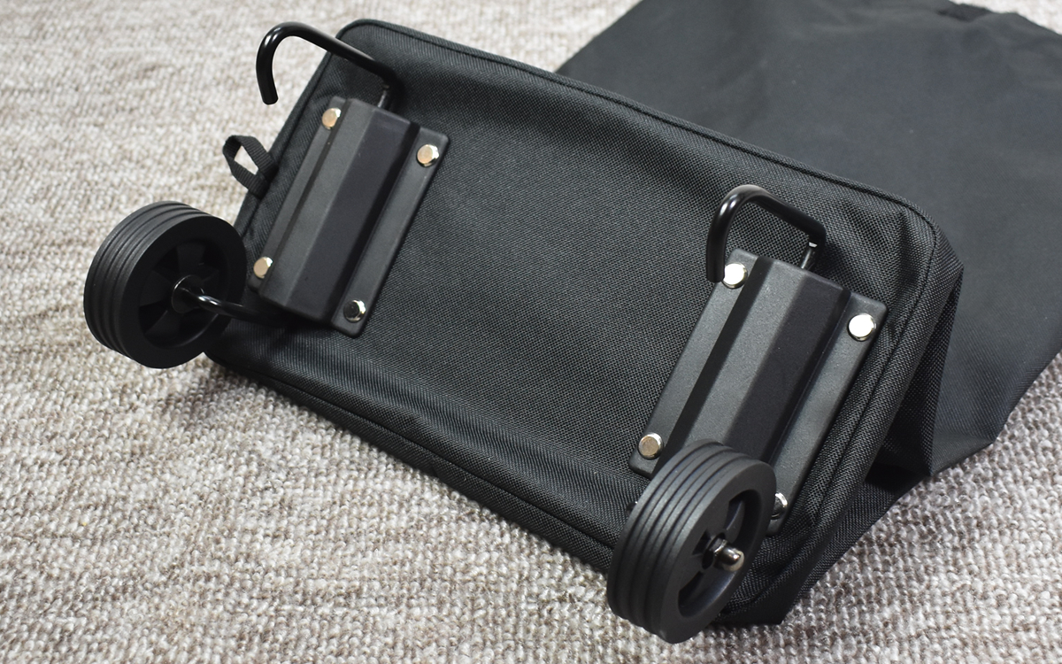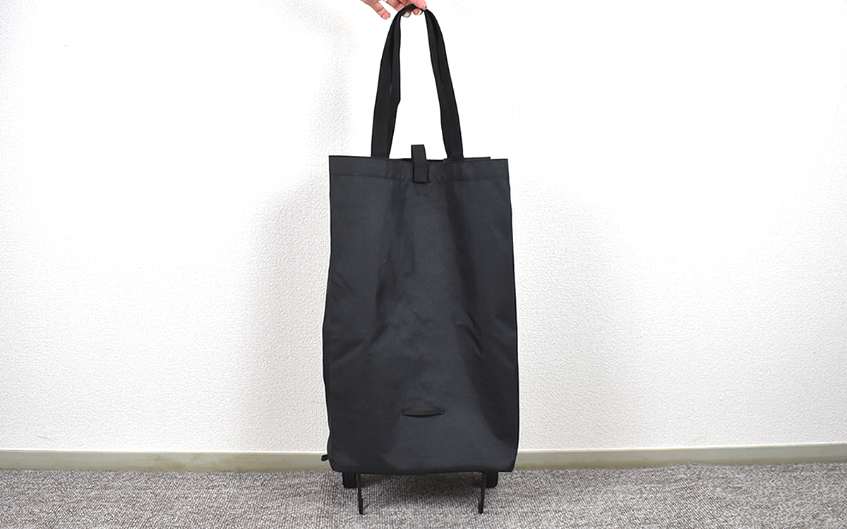 キャスターを使いたい時は、シャフト部分をワンプッシュするだけ。あっという間にキャスターが立ち上がり、肩掛けバッグからショッピングカートに変身しました。これなら、荷物が多くなってしまった時でも、手間なく簡単に使えるでしょう。