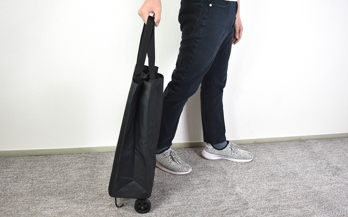 キャスターつきのショッピングカートにも関わらず、小さく折りたためる同商品。長めの持ち手がついているので、荷物がさほど重くない場合には肩掛けバッグとしても使用可能です。