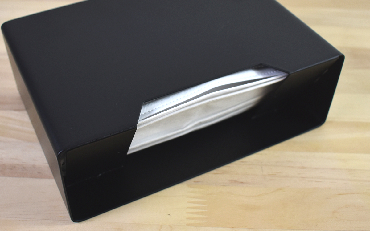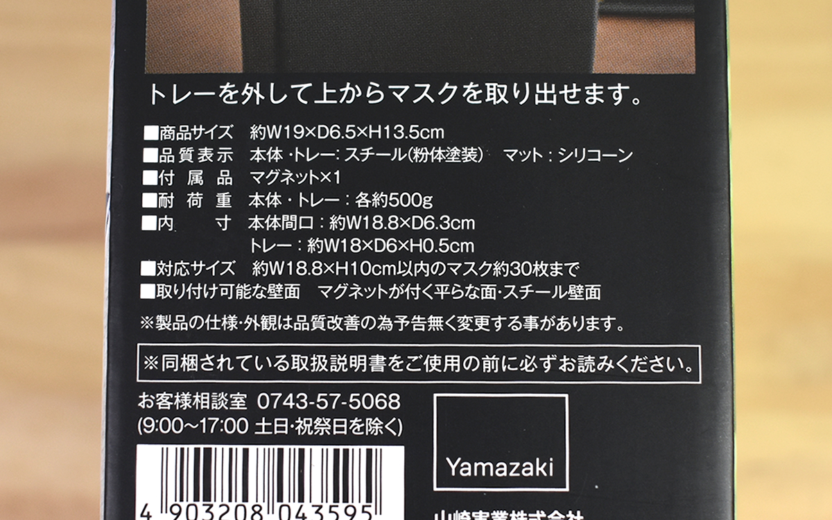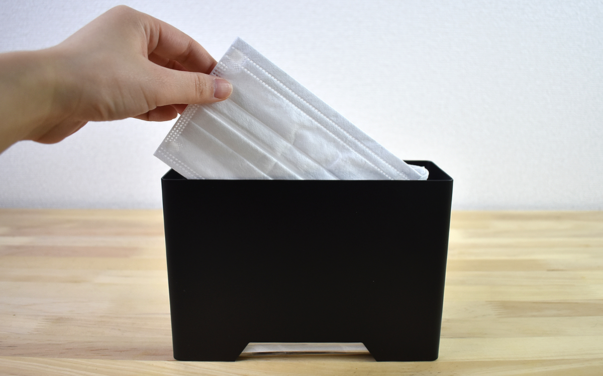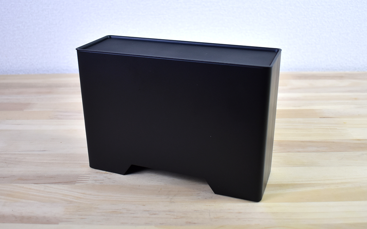 同商品はホワイトとブラックの2色が展開されていて、今回はシックなブラックを購入。サイズは約19(幅)×6.5(奥行)×13.5cm(高さ)、パッケージの説明によれば約30枚・1カ月分のマスクを収納することができます。