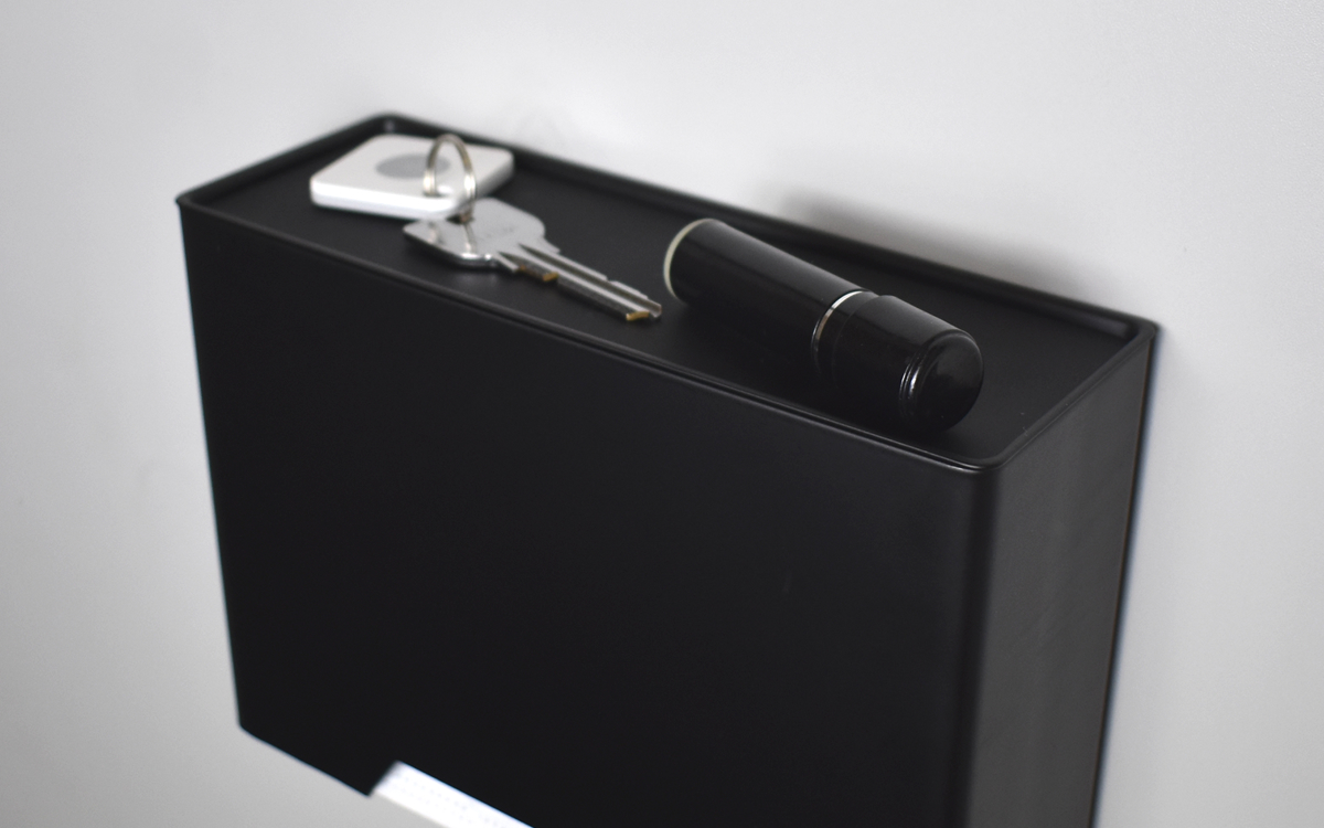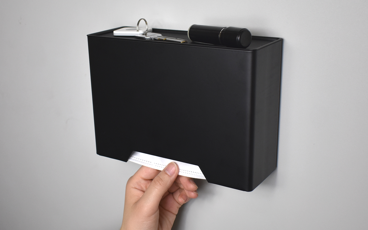 それでは玄関扉に取りつけてみましょう。トレーは印鑑や鍵など、玄関で手にする機会の多い小物を置いておくのにぴったり。また本体の底面が斜めになっているので、つまんだマスク1枚をするっと取り出すことができました。マグネットは強力なので、ちょっとやそっとのことで落下する心配はありません。