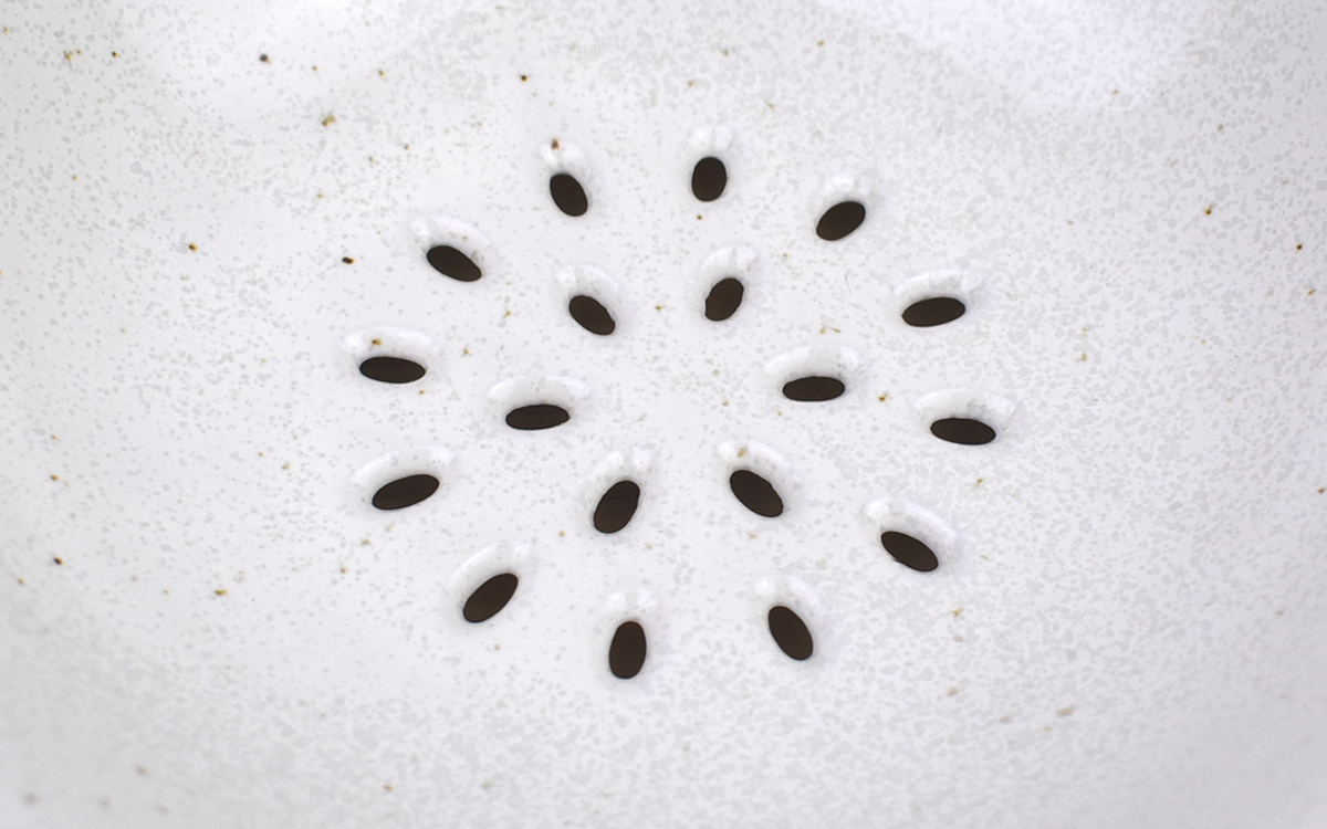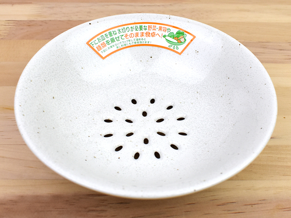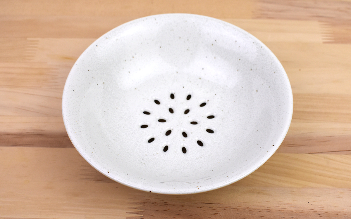 磁器製のプレートながら、名前の通り底にいくつもの穴が開いた同商品。サイズは18(幅)×18cm(奥行)で、底を除けば一般的なプレートとほとんど違いはありません。ちなみに白い器を好む人から注目を集める“粉引”とは、素材の土に白化粧を施した上で透明釉をかけたものを指します。