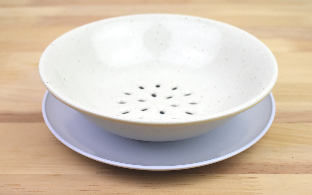 使用方法は至ってシンプル。穴あきプレートの下に別の皿を重ねて、野菜・果物・麺類など水を切りたい食材を乗せるだけ。染み出た水分は穴を通して皿に落ちるので、キッチンで盛りつけてそのまま食卓に並べられます。