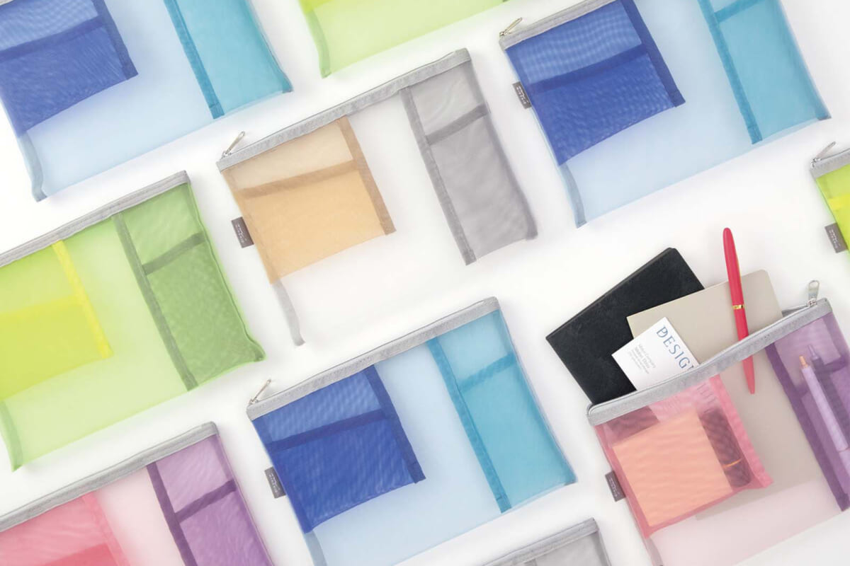 B6ノートが入るサイズのメッシュポーチ。内側にカードサイズのポケットと、筆記具などを入れやすい縦長のポケットがあり、中身を整理分類できる。ポケットと本体はそれぞれ異なる色でできている。税込968円