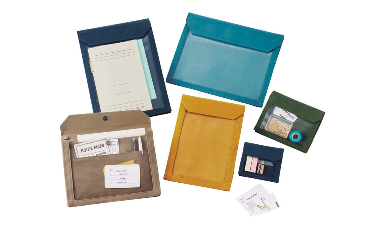 透明の窓が付いて中身が見えるポーチ「フラッティ」の帆布生地タイプ。丈夫さと、雑貨感のあるカラーリングが魅力だ。マチは35㎜と従来品の1.5倍。厚みのある小物も入れられる。税込935円〜