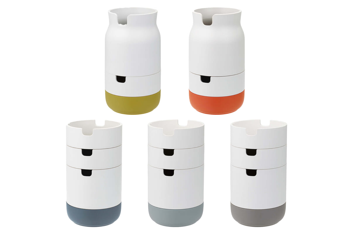 磁器のような質感とデザインがオシャレな収納ツール。小物入れが積み重なった構造で、使用時は広げて取り出しやすく、収納時は重ねてスッキリしまえる。各段を固定できるロック機構付き。税込1870円