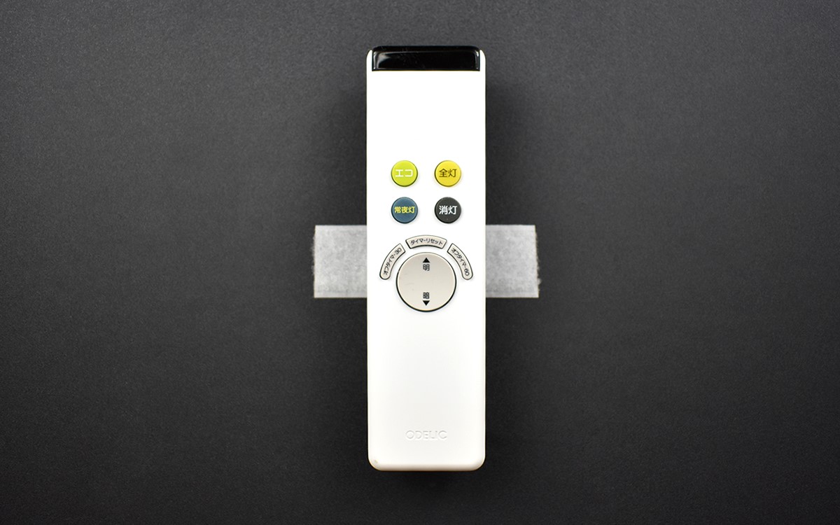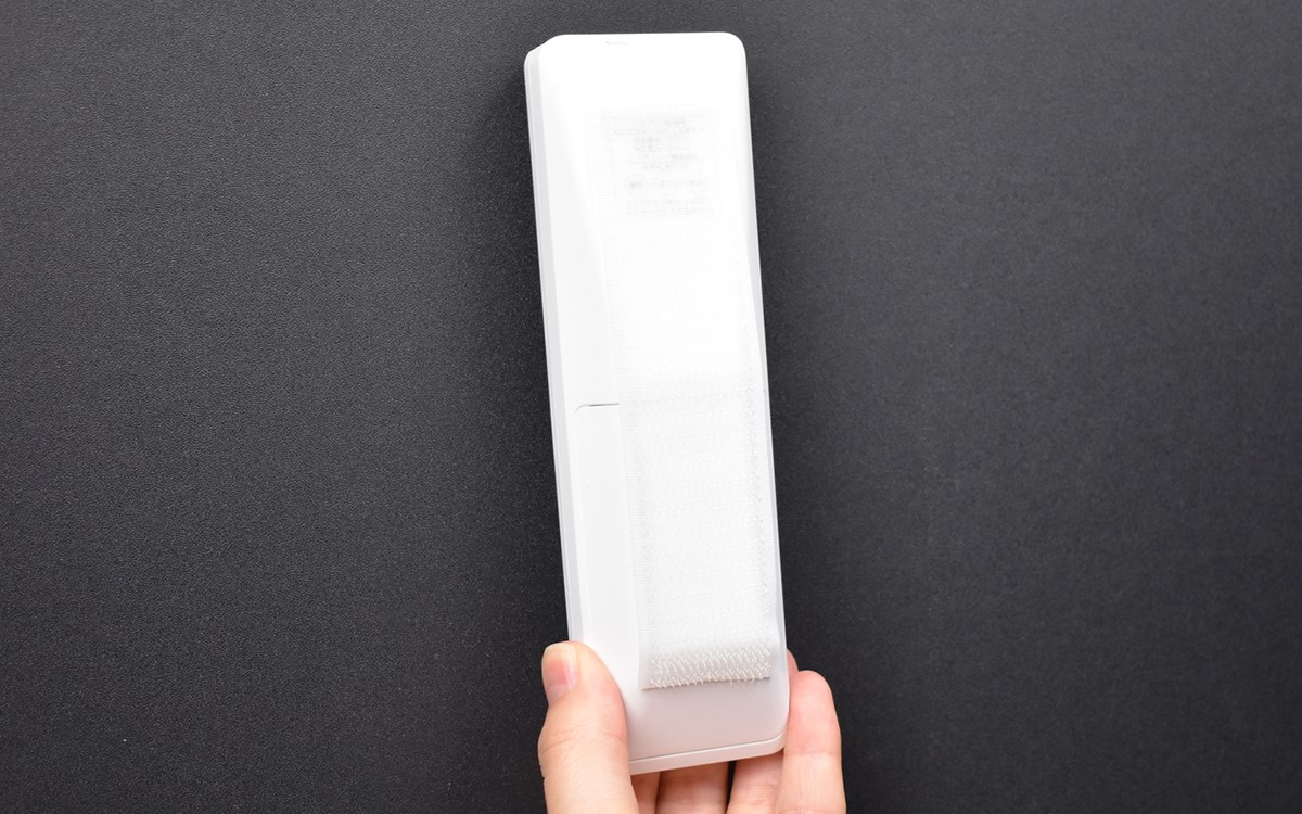 それでは、実際にリモコンを取りつけてみましょう。リモコンの背面にもテープを貼り、壁面側のテープにペタリ。面ファスナー同士の接着が強く、リモコンをしっかり固定することができました。今回はリモコンで試しましたが、もちろんフォトフレームなどのインテリアアイテムを固定するのにもオススメです。