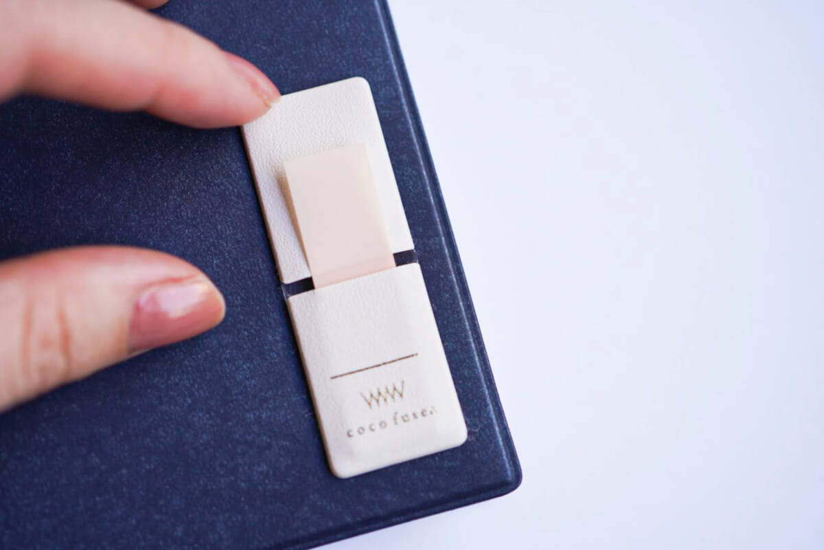 その秘密は、ケースにあります。オーソドックスな「ココフセン」やココフセン ベーシックは、ケースの裏が粘着シールになっているので、手帳やノートにケースごと貼りつけられるのです。