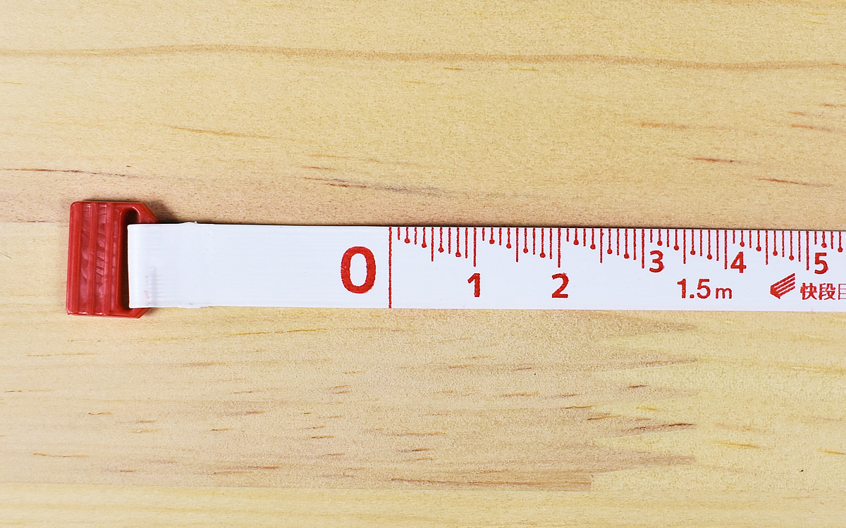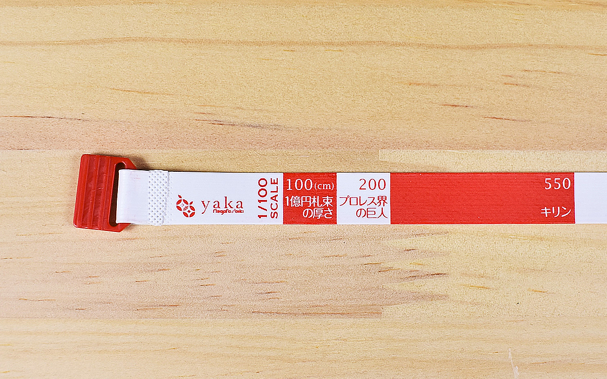 試しにメジャーを引っ張ってみたところ、表側は至って普通の目盛りが。何の変哲もありませんが、裏側を見てみると1/100スケールで記載された距離や大きさを発見。「100(cm)1億円札束の厚さ」など、ユニークな目盛りがズラリと並んでいました。バラエティに富んだ目盛りに、思わずクスッと笑みがこぼれてしまいます。