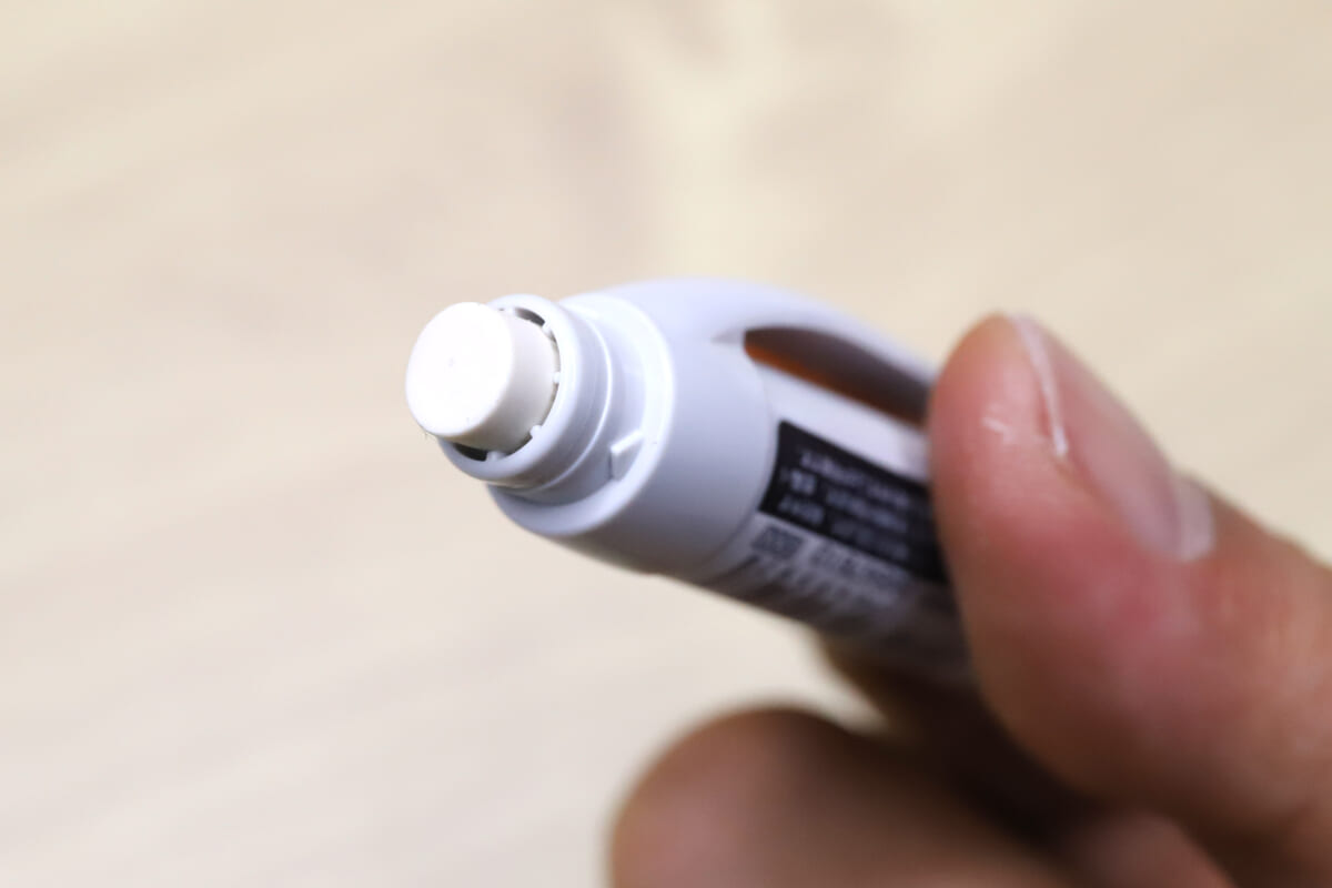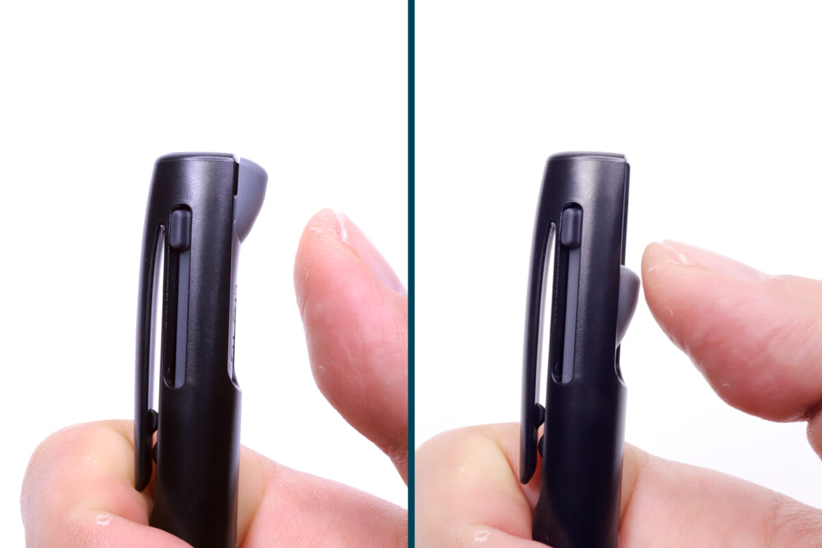 シャープは切り替えだけでなく芯出しでもノックするので、大きなノブは使いやすそうだな、と思っていたのだが……このノブ、切り替えでスライドさせた時点で、軸に大きく沈み込んでしまう。そのため、芯出しノックがかなりしづらいのだ。さらに上面に丸みがついているため、指掛かりも悪い。