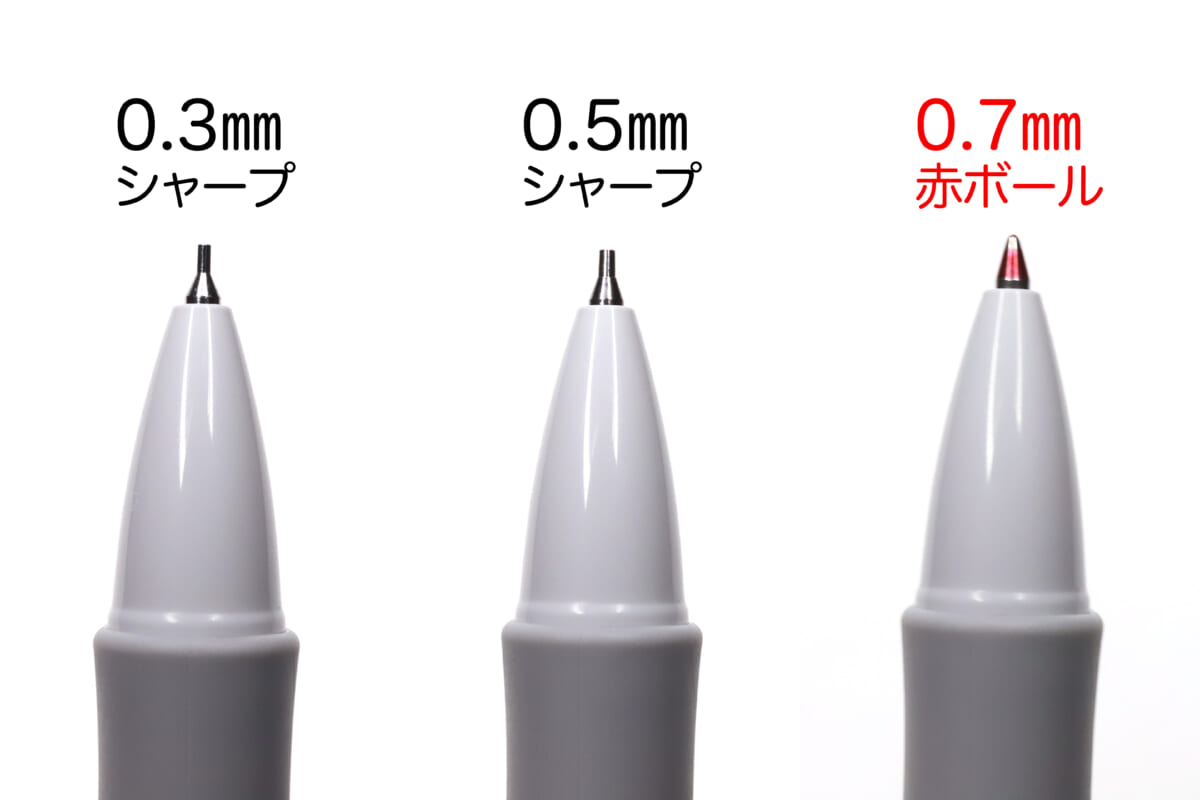 なにが振り切っているかというと、まず多機能の構成が名前の通り「0.5mmシャープ+0.3mmシャープ+0.7mm赤ボールペン」という部分だ。