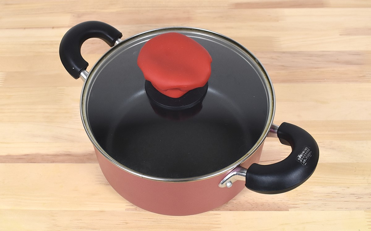 試しに鍋にセットしてみると、思った以上の握りやすさを実感。コック帽のようなフォルムのおかげで、帽子部分のシワが手のひらにジャストフィットしました。しかも、シリコーン素材でできているので、指を滑らせてしまう心配はありませんよ。