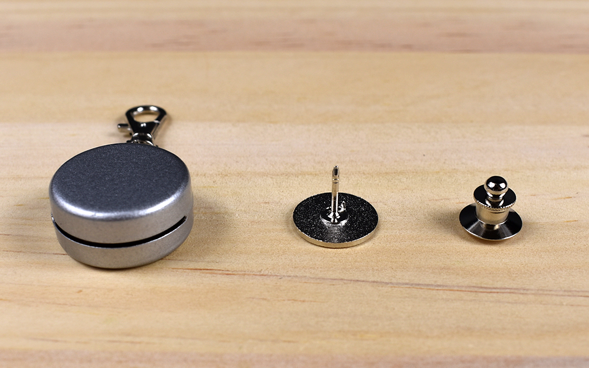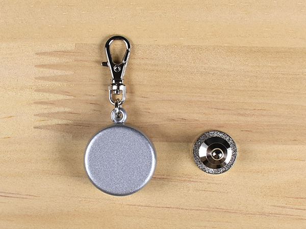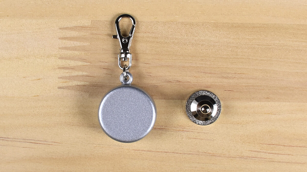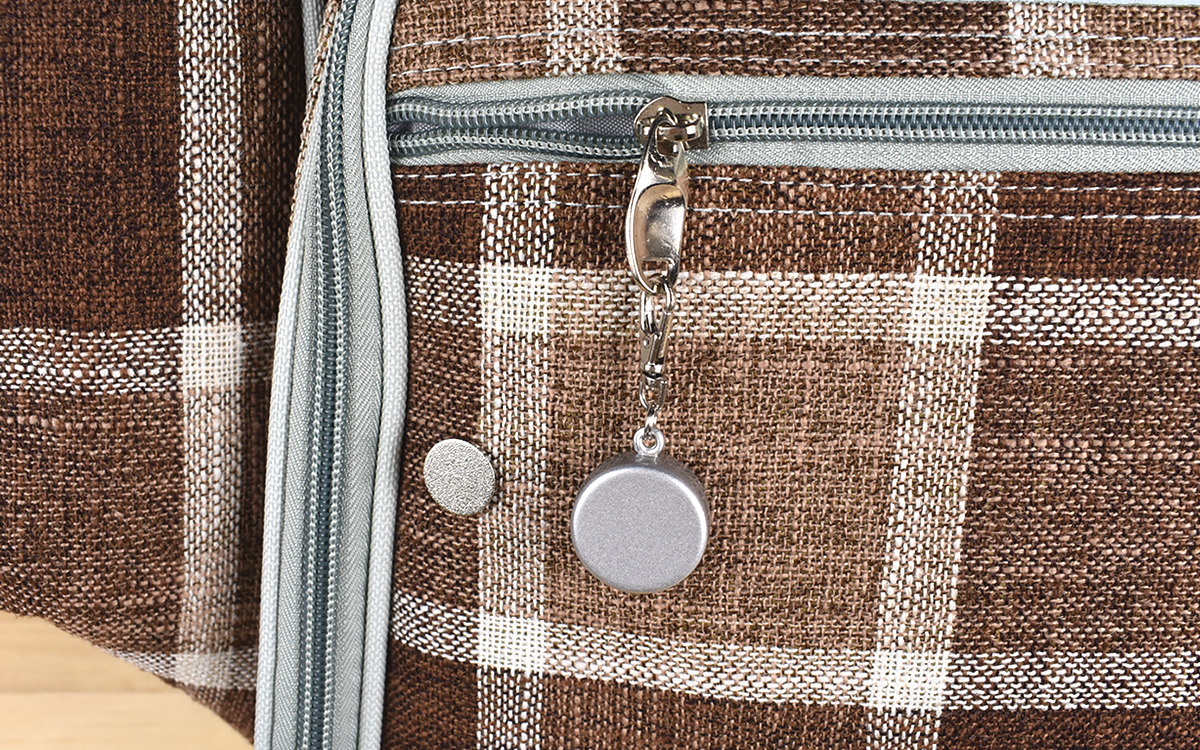 驚くべきは鈴の音の大きさだけでなく、ネオジム磁石の威力。ファスナーを締めると、引き寄せられるようにピタっとピンバッチ表面にくっ付きました。ネオジム磁石が固定されることで鈴は鳴らなくなるため、音が聞こえてこなければ安心して移動できますよ。