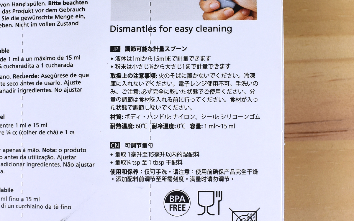 ハンドルをよく見ると“ml・tsp・tbs”の表記と数字が刻まれ、それぞれの目盛りに合わせやすいよう本体には三角の目印が。同商品が1つあれば液体なら1~15mlまで、小さじ(tsp)4分の1~大さじ(tbs)1杯まで計量OK。ハンドルを動かす際は少し強めの力が必要なので、計量中に目盛りがズレてしまう心配はありません。