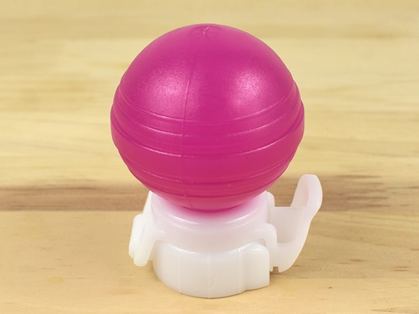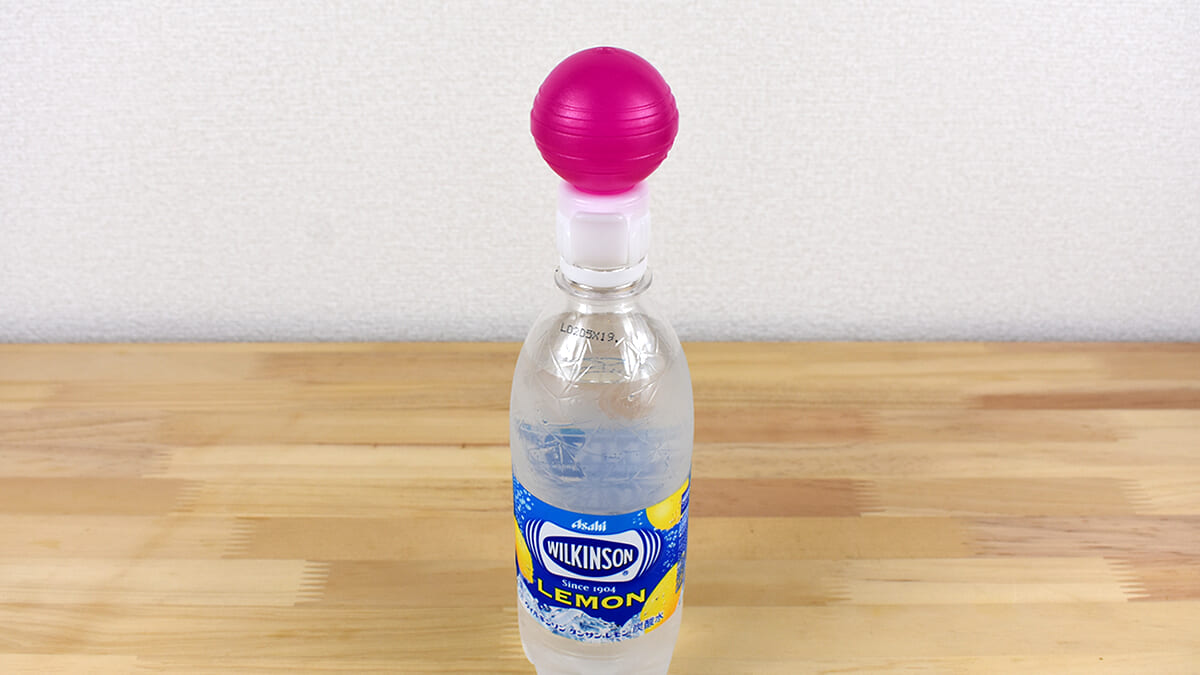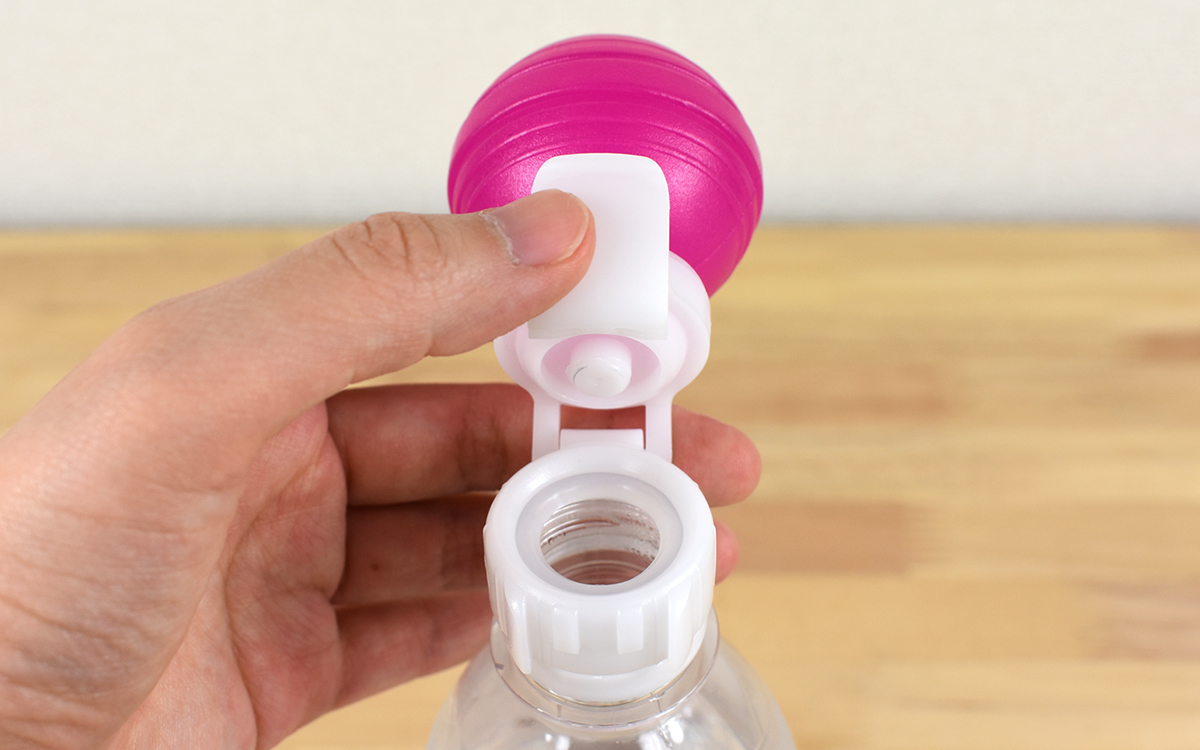同商品はピンク・イエロー・ブルーの3色を展開していて、今回は鮮やかなピンクタイプをセレクト。実はボールのように見えるのは“ポンプ”で、サイズはキャップ部分も含めて4.5(幅)×7.2(高さ)×5cm(奥行)。実際にペットボトルの飲み口へ取りつけてみたところ、ちょっぴりシュールなビジュアルに……。