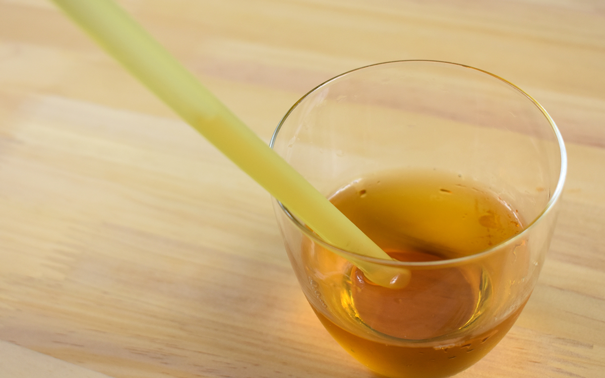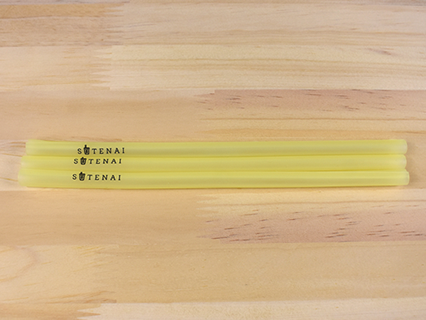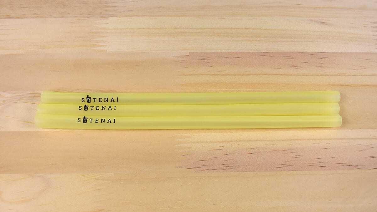 数あるカラーバリエーションの中から、今回は「YELLOW-SEMI-CLEAR-」タイプを購入。シリコーンゴム製とはいえ見た目は一般的なストローと変わりなく、写真のようにお茶の入ったコップで使用しても違和感はありません。