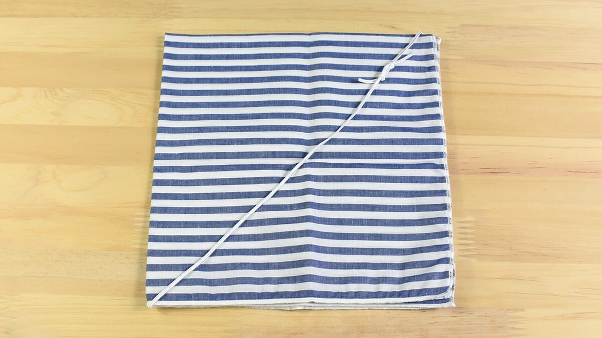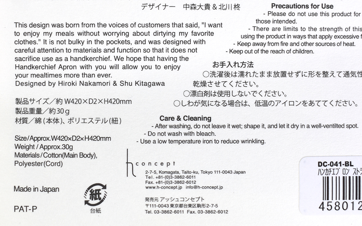 同商品のサイズは約420(幅)×2(奥行)×420mm(高さ)。もちろん普段はハンカチとして、ポケットに入れて持ち運ぶことができます。いざ食事のタイミングになったら、ハンカチの縁から出ている紐を首にかければエプロンに早変わり。あとはハンカチの角を内側に折りこむだけなので、ほとんど手間がかかりません。