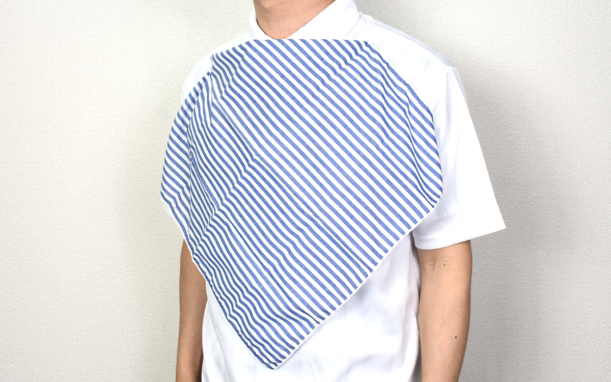 外出先で食事をしていて、ソースや汁の跳ね返りが気になったことはありませんか? そんなときに活用したいのが、今回セレクトした「ハンカチエプロン」(2420円/税込)です。ベージュやダークグレーなど複数あるカラーバリエーションから、爽やかな“ストライプブルー”タイプを購入してみました。