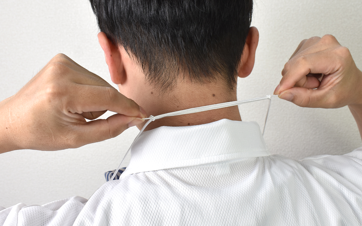 体格によってエプロンの位置に誤差が生じますが、紐の両端を引っ張ることで長さ調節ができるため、しっかり襟元までカバーしてくれました。