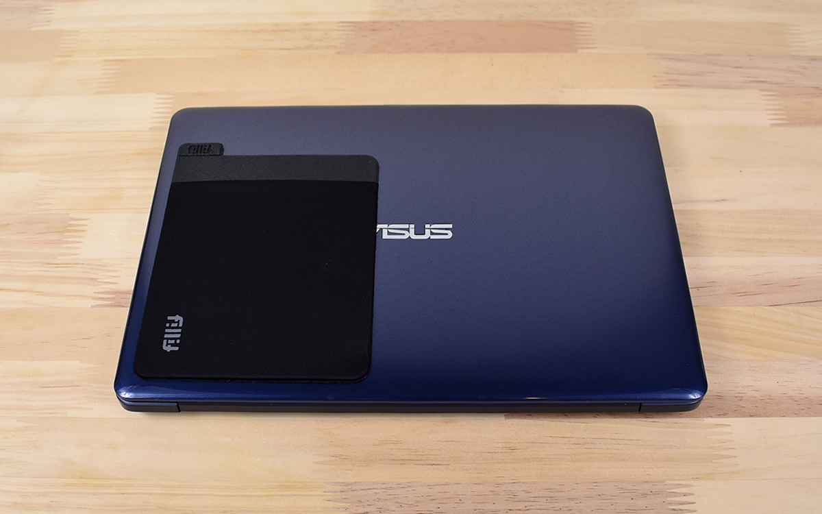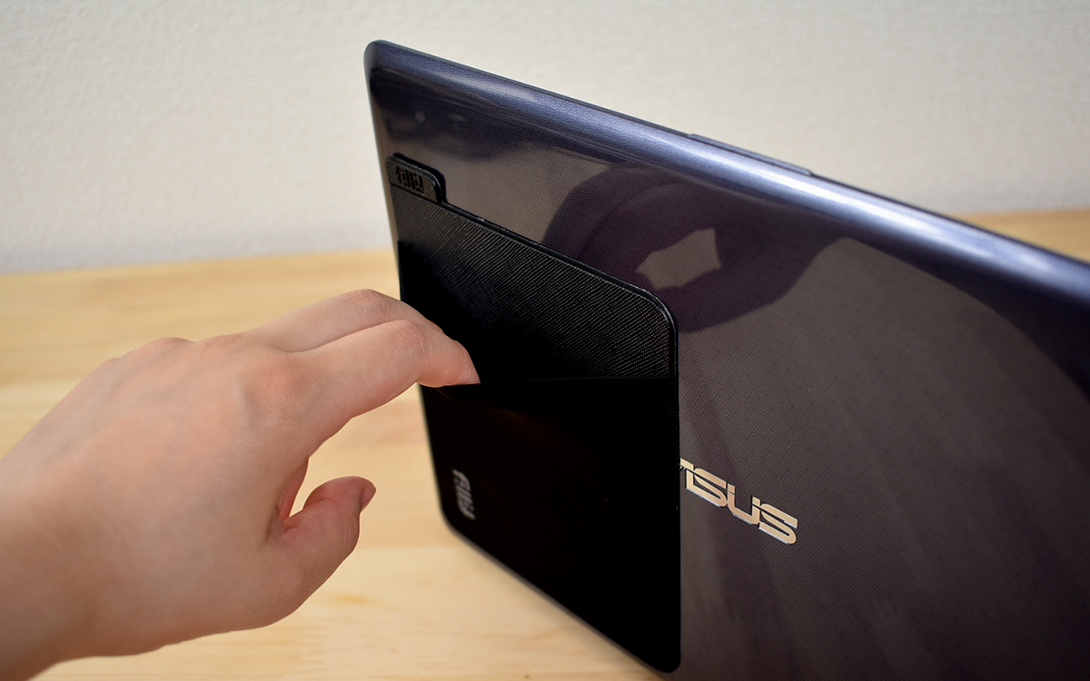 同商品のサイズは約11.4(幅)×14cm(高さ)。パッケージから取り出すとポケットがクリアシートに貼られているので、さっそく剥がしてパソコンに貼ってみました。特殊な接着剤が使用されていることもあり、パソコンに貼り付く力はなかなかのもの。接着力が強い一方何度も貼り直しが可能で、ポケットを使わないときはクリアシートに貼って保管できます。