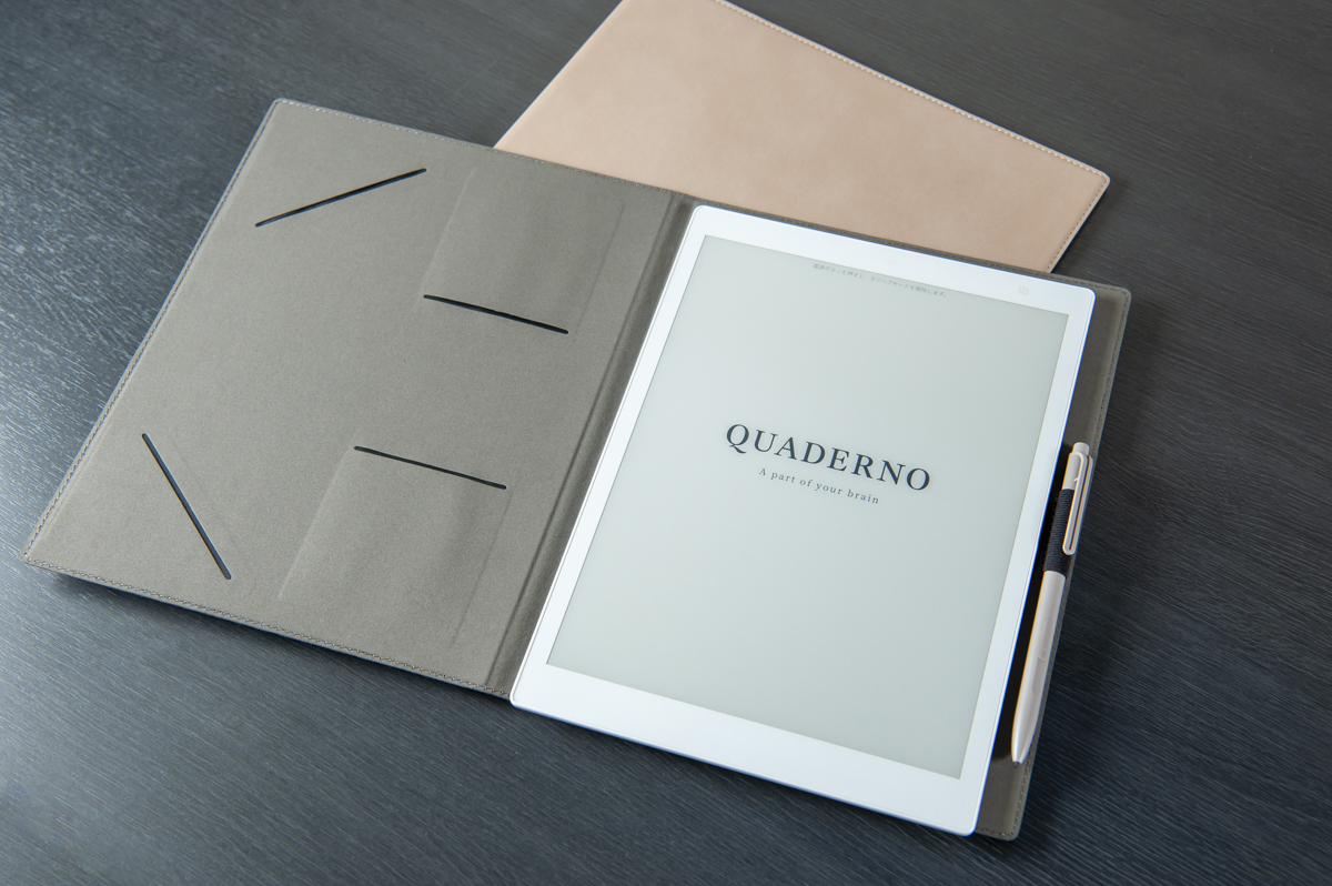 クアデルノは文房具としての面白みもあります。普段持ち歩くものだから、やはりおしゃれなカバーは着けたいところ。新しいクアデルノでは、A4/A5サイズのそれぞれにベージュとネイビーの2色の専用カバーがアクセサリとして同時発売されます。旧モデルでは、カバーを付けるとあまりにも重くなるためA4サイズは専用カバーが用意されませんでしたが、今回は大幅な軽量化に成功したため、A4サイズでもカバーが販売されます。