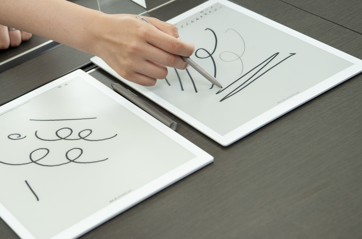 ここで旧モデルと新モデルを並べて試し書きをさせて頂いたところ、新モデルは旧モデルよりも反応が速く、かなり書き心地が良くなっていると感じました。バッテリレスになったことでペンも軽くなっており、図や文字もさらさらと書けます。紙に書いているような感覚がより強くなっていると感じました。