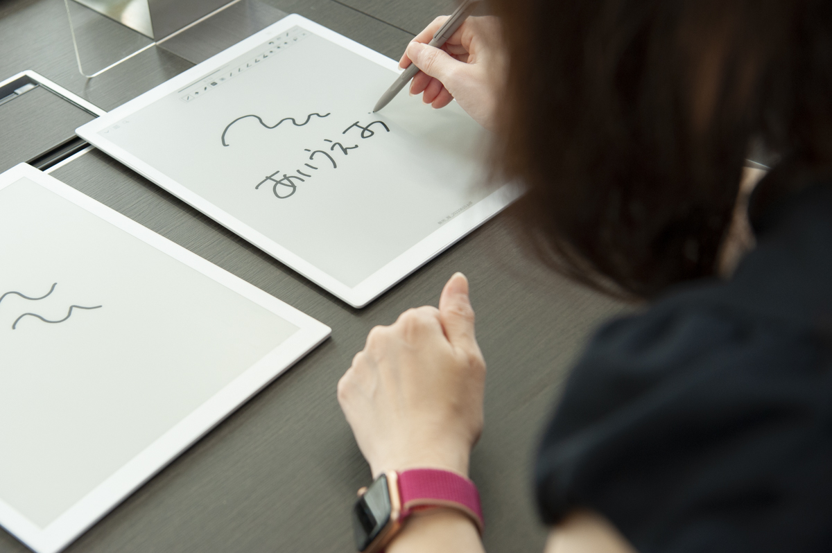 「デジタイザにより、曲線や斜め線が従来よりもなめらかに書けるようになりました。さらに垂直気味に書いても、寝かせ気味に書いても傾きを検知して補正をかけるため、本体を縦・横どちらにしても、どの方向から書いてもなめらかに書くことができます。これにより、旧モデルでは必要だった右利き、左利きの設定も不要になりました」(松下氏)